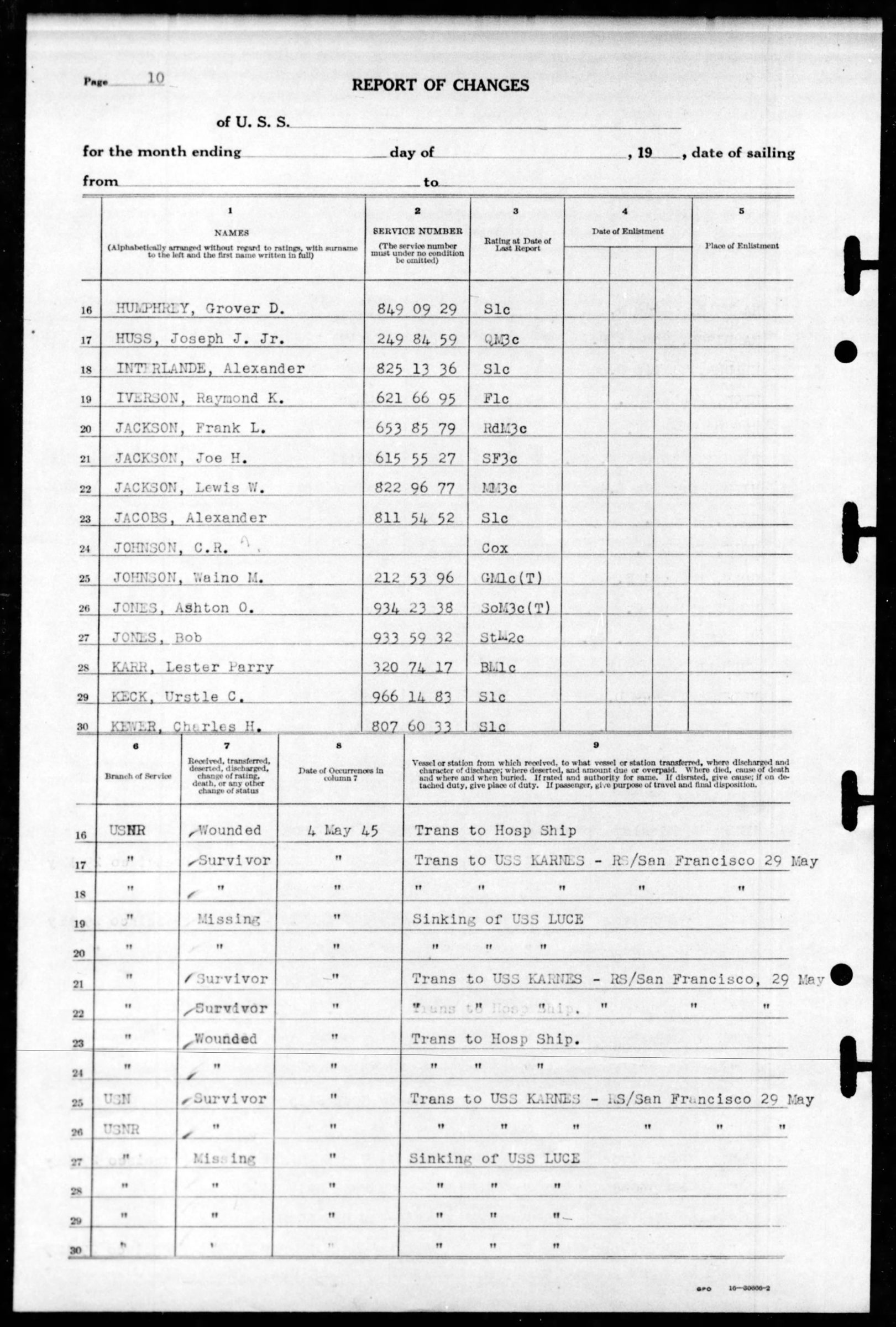 Shortly after midnight on May 4, the Luce observed from its picket station off Zampa Point, Okinawa, two Jap planes closing in. The luck of the Luce held up, though, and the planes turned away without pressing the attack. At 0740 the same day, Jap planes attacked in force the vicinity where the Luce was stationed. Two of them approached her port side and were taken under fire. The plane split their attack and fire was concentrated on the one to the left. The right hand plane then headed directly for the ship, veered sharply to its left, headed across the bow, then banked again and crashed close aboard the starboard side abreast number 1 stack. Immediately after, another plane approached low in the water on the port quarter and crashed into the aft part of the ship. The ship maintained an even keel for a brief moment, suddenly settled by the stern and listing heavily to starboard, sank rapidly in 300 fathoms of water.