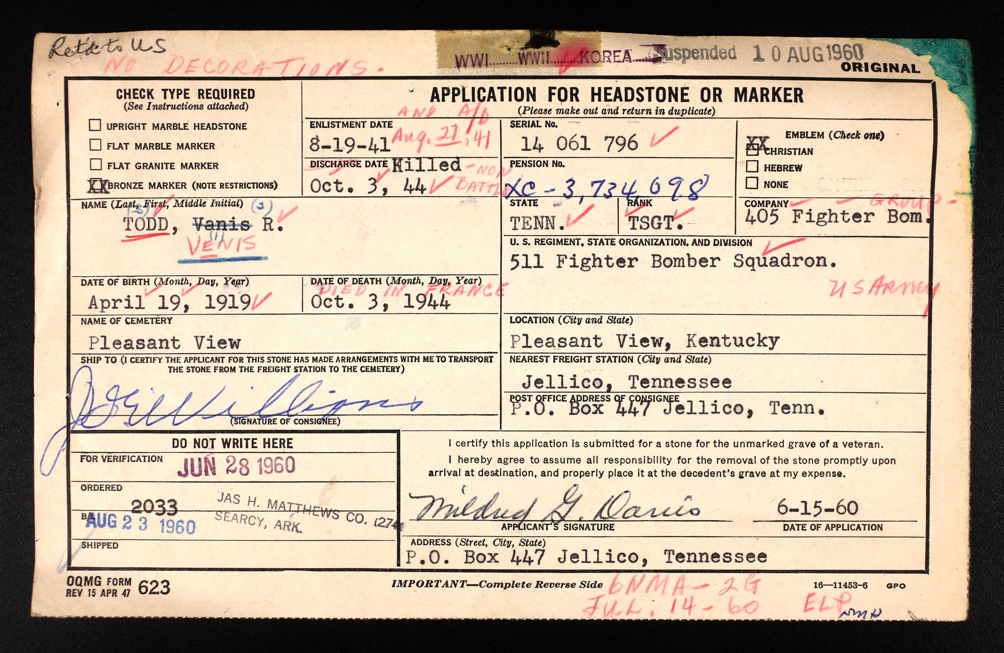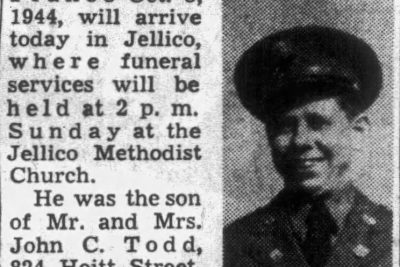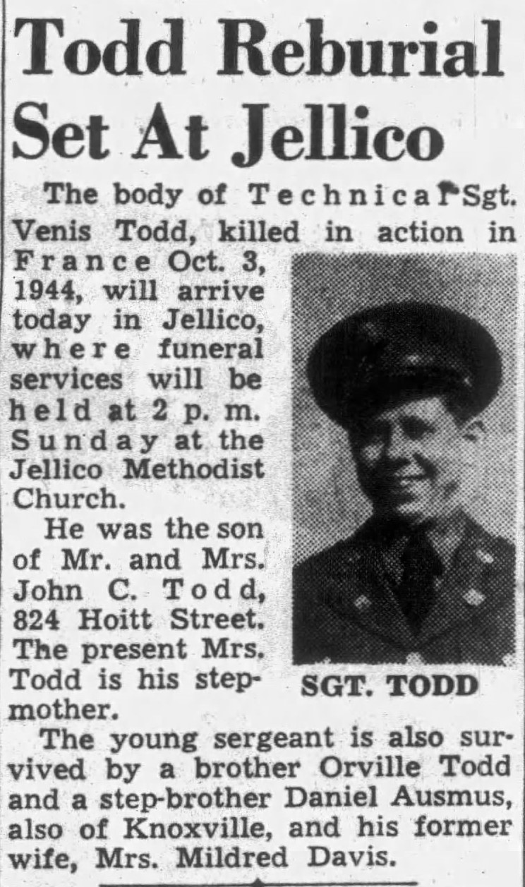 The body of Technical Sgt. Venis Todd, killed in action in France Oct. 3, 1944, will arrive today in Jellico, where funeral services will be held at the Jellico Methodist Church. He was the son of Mr. and Mrs. John C. Todd, 824 Hoitt Street. The present Mrs. Todd is his stepmother. The young sergeant is also survived by a brother Orville Todd and a step-brother Daniel Ausmus, also of Knoxville, and his former wife, Mrs. Mildred Davis.