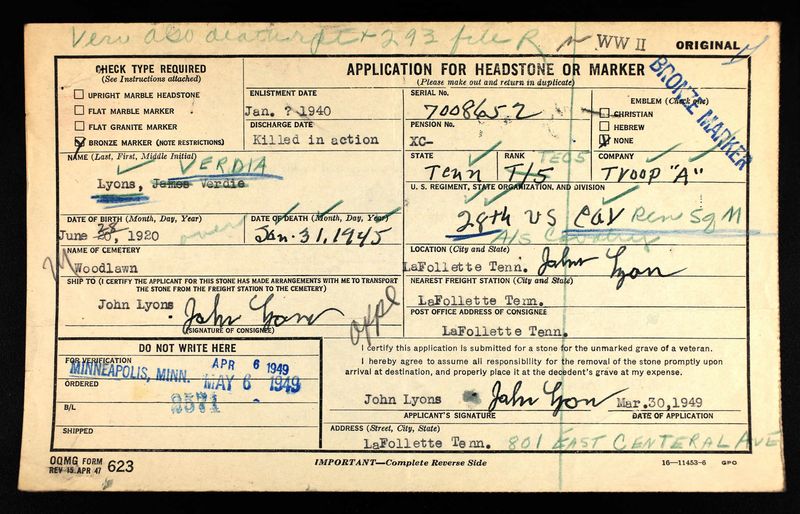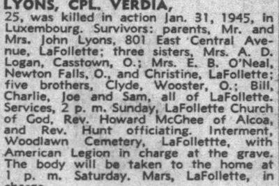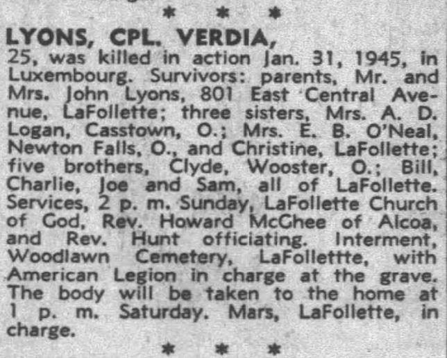 Cpl. Verdia Lyons, 25, was killed in action Jan 31, 1945, in Luxembourg. Survivors: parents, Mr. and Mrs. John Lyons 801 East Central Avenue, LaFollette; three sisters, Mrs. A.D. Logan, Casstown, O.; Mrs. E.B. O’Neal, Newton Falls, O., and Christine, LaFollette; five brothers, Clyde, Wooster, O.; Bill, Charlie, Joe and Sam, all of LaFollette.