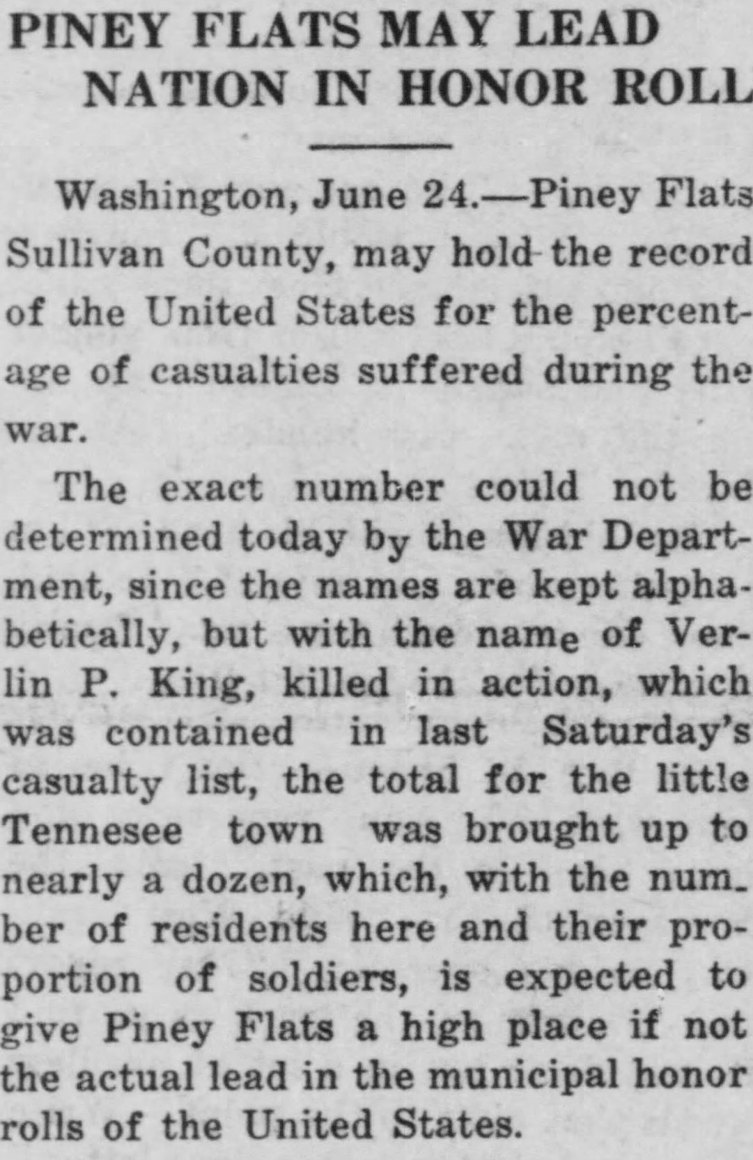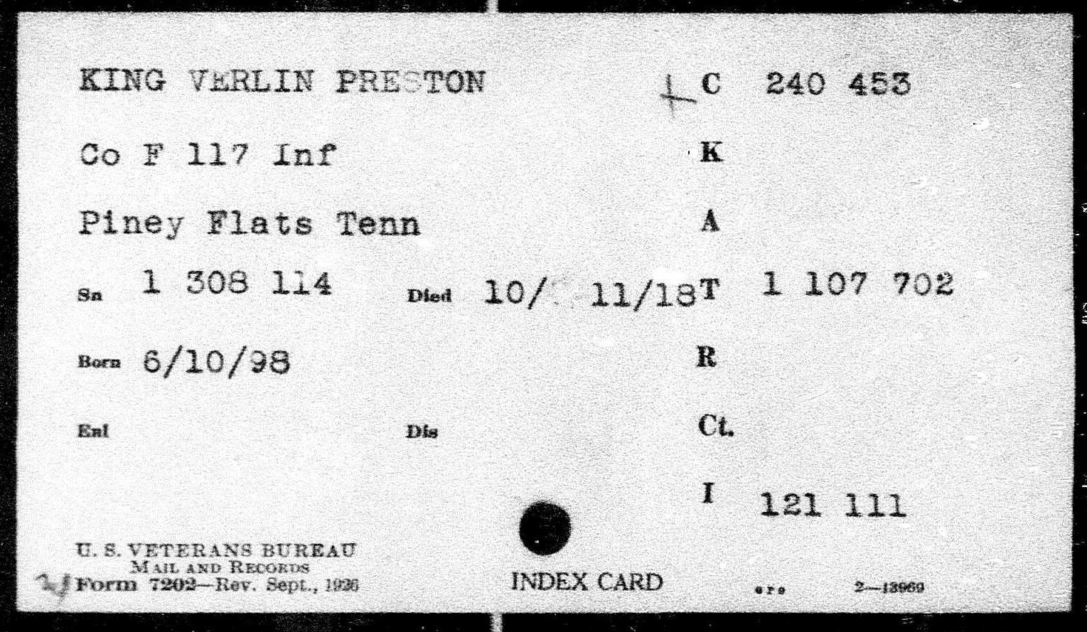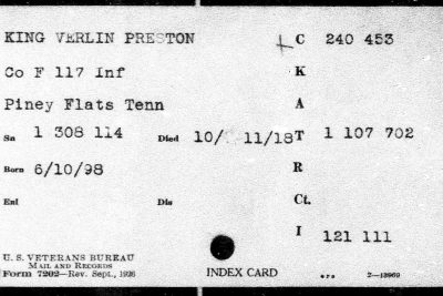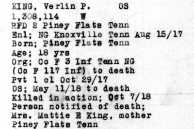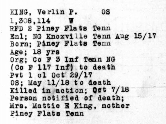 Verlin Preston King was born 11 June 1900, son of James Anderson King and Elizabeth Jane Hodge. He was killed in action in France 7 October 1918
