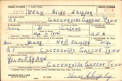 Vern Clide Shipley was born on 11 December 1918 at Greeneville, Tennessee, the son of Sidney Leander Shipley and Addie Belle Broyles. Husband of Mary Nell Price. Pvt. Shipley was employed with the Frazier-Brace Eng. Co. in Kingsport before entering the service August 8, 1943. He received his basic training in Mississippi and Kentycky. He landed in Frnace, after three months in England.