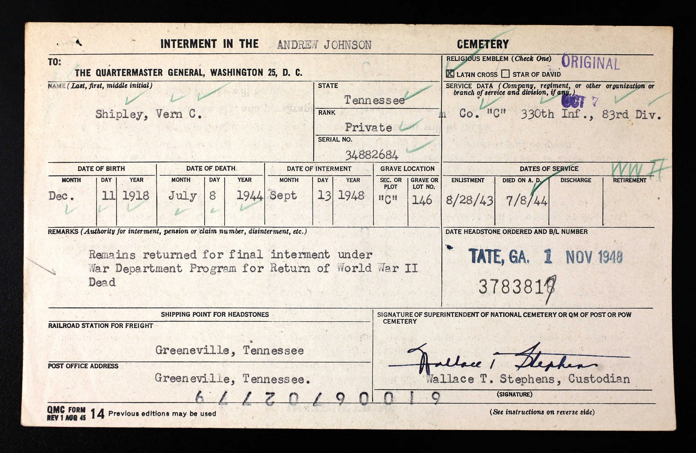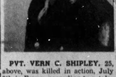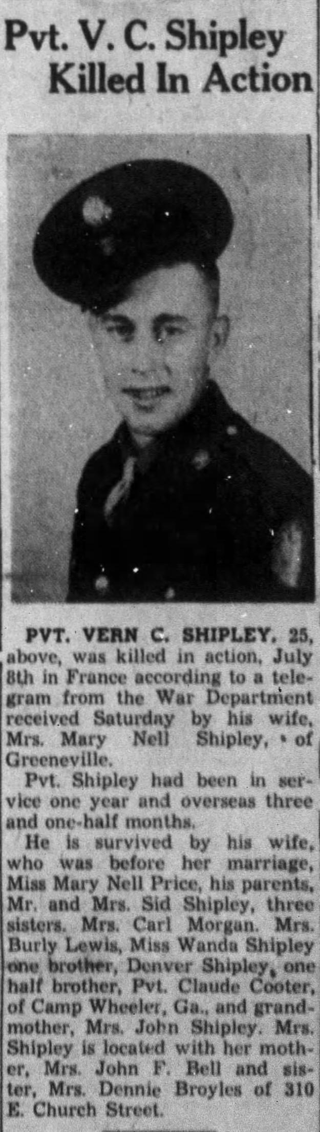 Pvt. Vern C. Shipley, 25, was killed in action July 8 in France according to a telegram from the War Department received Saturday by his wife, Mrs. Mary Nell Shipley of Greeneville.