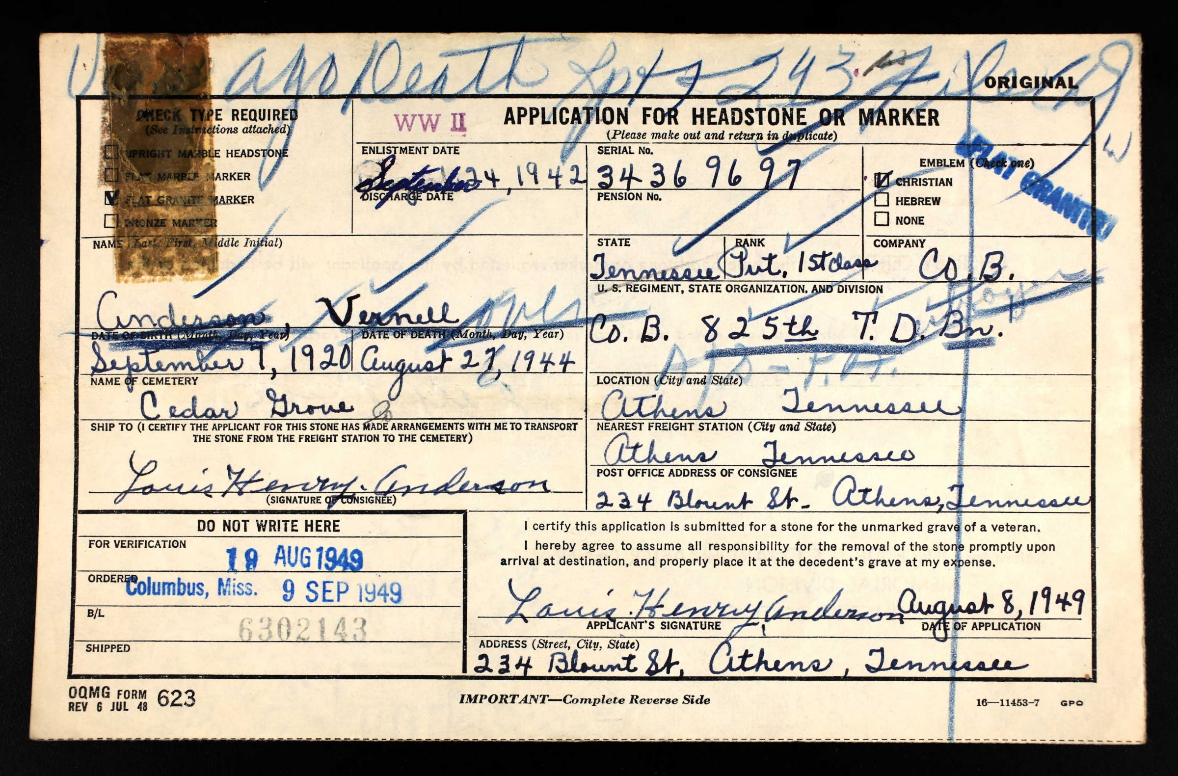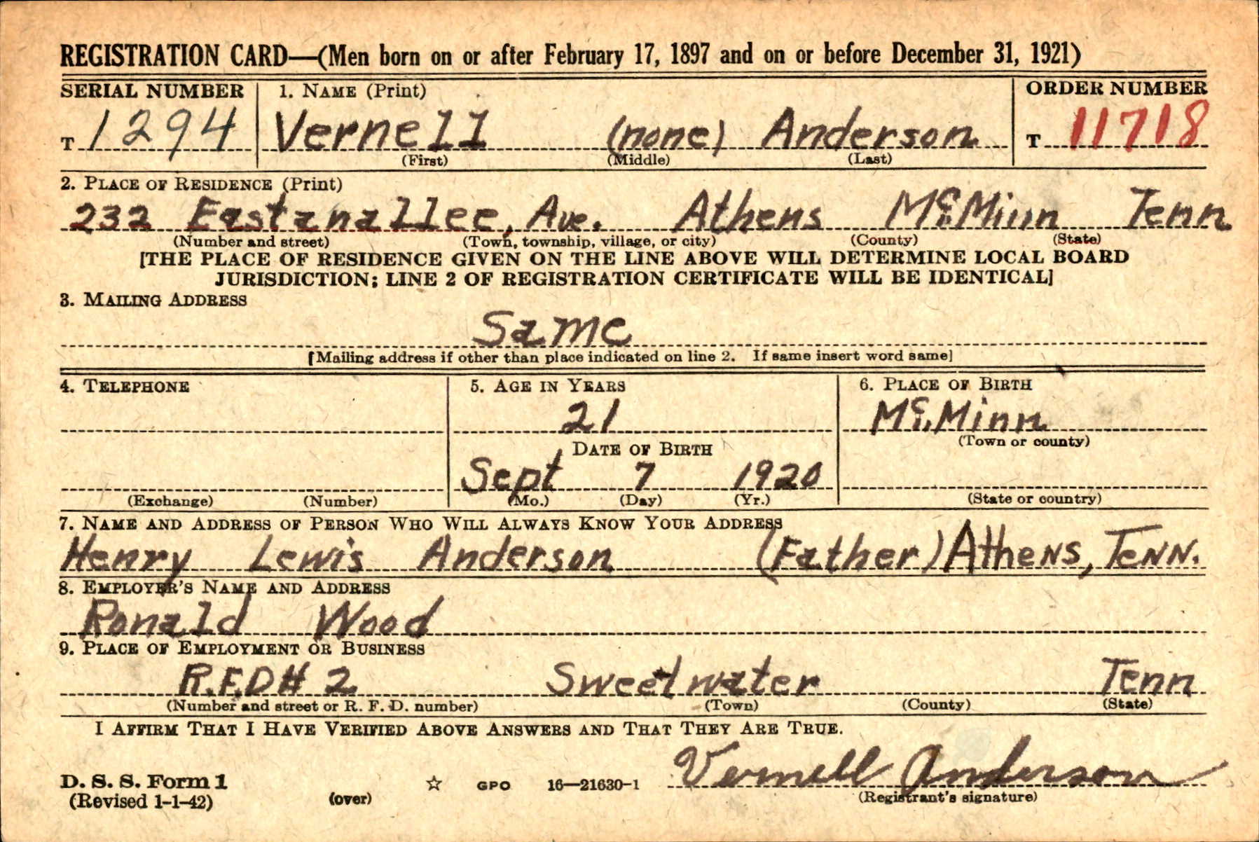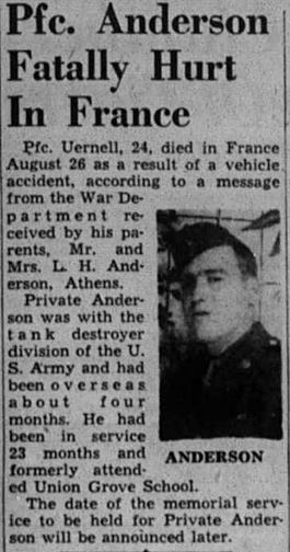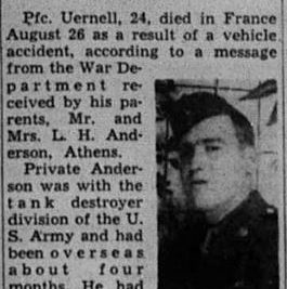 Vernell Anderson was born 7 September 1920 to Lewis Henry Anderson and Stella Osborn. He died 27 August 1944 in France as a result of a vehicle accident. He had been in service 23 months and overseas for about four months. He is buried at Cedar Grove Cemetery, Athens, TN.