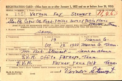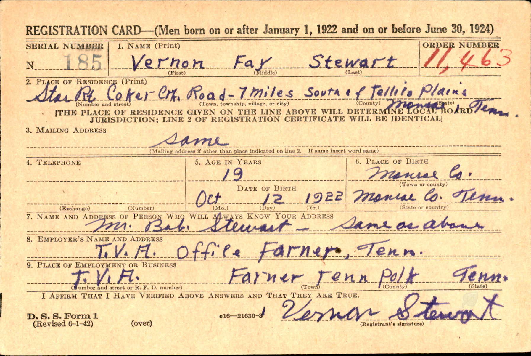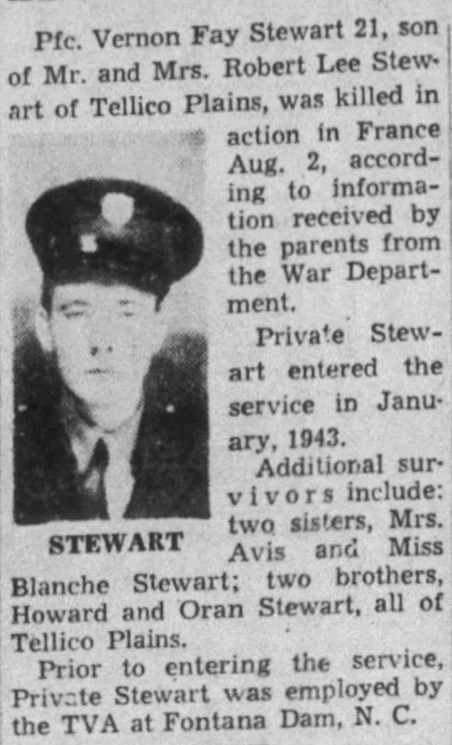 Pfc. Vernon Fay Stewart, 21, son of Mr. and Mrs. Robert Lee Stewart of Tellico Plains, was killed in action in France Aug. 2, according to information received by the parents from the War Department. Private Stewart entered the service in January, 1943. Prior to entering the service Private Stewart was employed by the TVA at Fontana Dam, N.C.