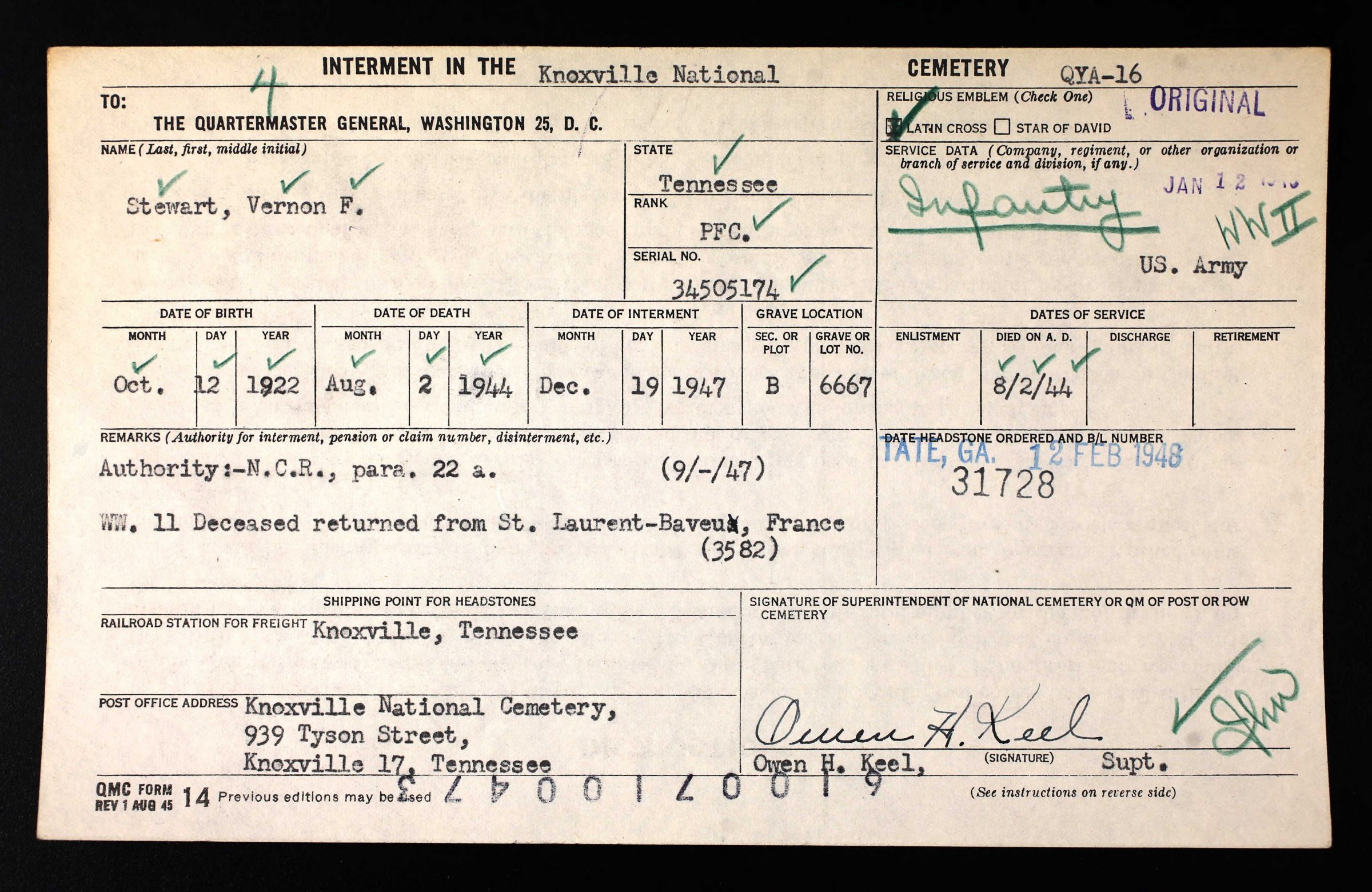 The body of Pfc. Vernon Faye Stewart of Tellico Plains is back from France. Vernon was killed in the battle of St.-Lo on August 2, 1944. Vernon F. Stewart was returned from St. Laurent-Bayeux, France.