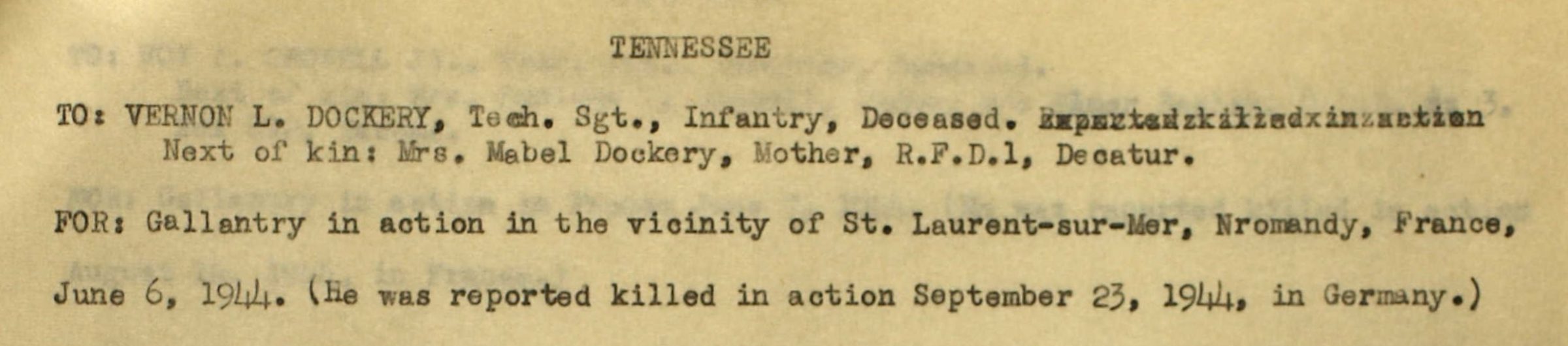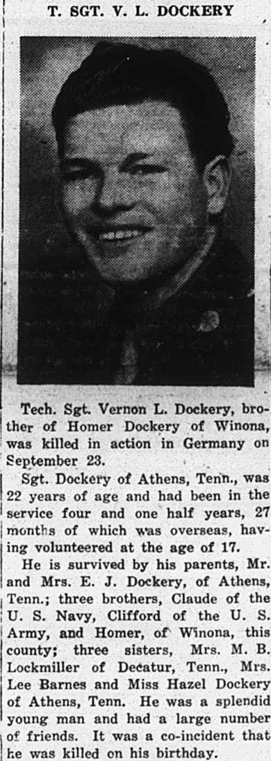 Tech. Sgt. Vernon L. Dockery, brother of Homer Dockery of Winona, was killed in action in Germany on September 23. Sgt. Dockery of Athens, Tenn., was 22 years of age and had been in the service four and one half years, 27 months of which was overseas, having volunteered at the age of 17. He is survived by his parents, Mr. and Mrs. E.J. Dockery, of Athens, tenn.; three brothers, Claude of the U.S. Navy, Clifford of the U.S. Army and Homer of Winona, this county; three sisters, Mrs. M.B. Lockmiller of Decatur, Tenn., Mrs. Lee Barnes and Miss Hazel Dockery of Athens, Tenn. He was a splendid Young man and had a large number of friends. It was a co-incident that he was killed on his birthday.