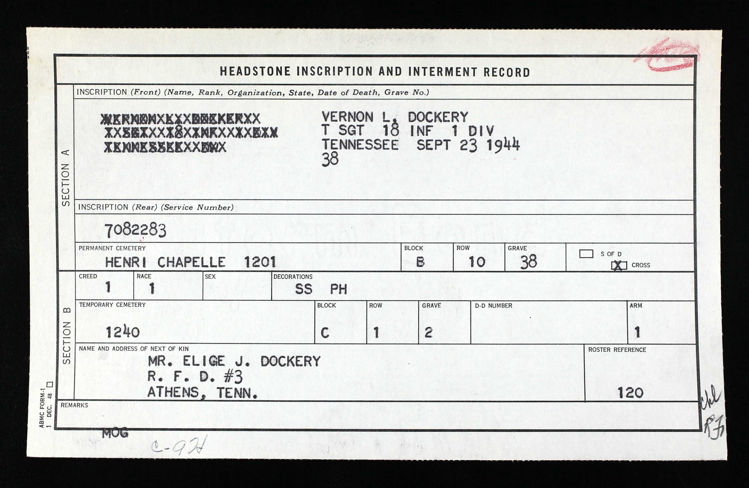 TSgt Dockery died on the 23rd of September 1944. He was interred at Henri-Chapelle American Cemetery, Belgium, plot B, row 10, grave 38.