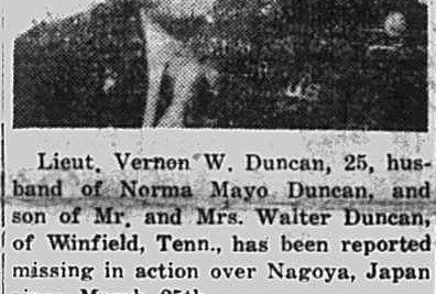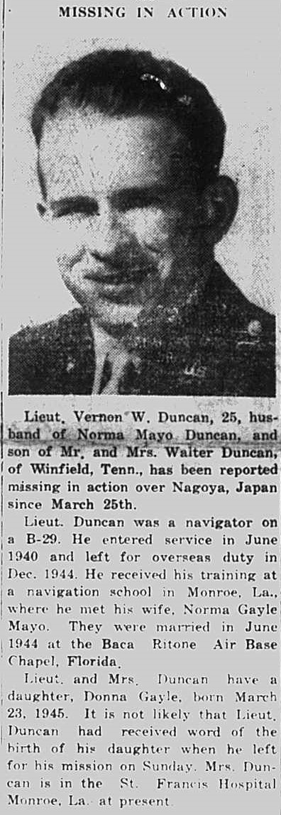 Lieut. Vernon W. Duncan, 25, husband of Norma Mayo Duncan, and son of Mr. and Mrs. Walter Duncan, of Winfield, Tenn., has been reported missing in action over Nagoya, Japan since March 25th. Lieut. Duncan was a navigator on a B-29. He entered service in June 1940 and left for overseas duty in Dec. 1944. He received his training at a navigation school in Monroe, La., where he met his wife, Norma Gayle Mayo. They were married in June 1944 at the Baca Ritone Air Base Chapel, Florida. Lieut. and Mrs. Duncan have a daughter, Donna Gayle, born March 23, 1945. It is not likely that Lieut. Duncan had received word of the birth of his daughter when he left for his mission on Sunday. Mrs. Duncan is in the St. Francis Hospital Monroe, La. at present.