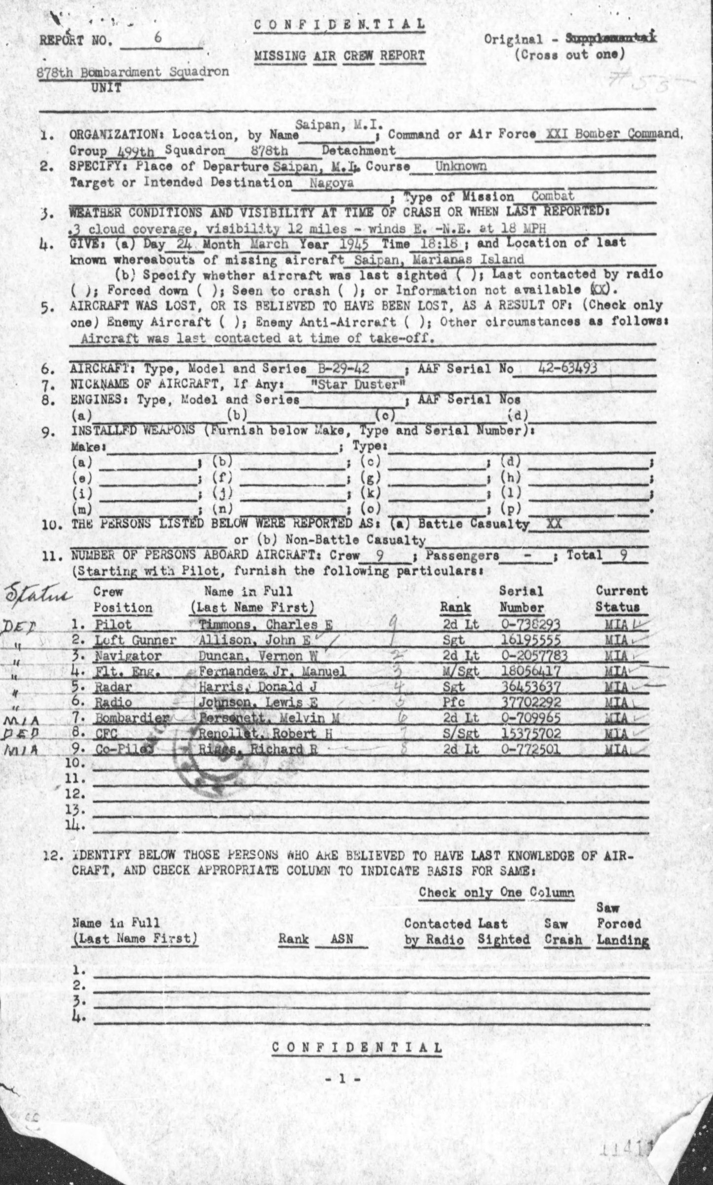 MACR 13826, submitted by the 878th Bombardment Squadron, 499th Bombardment Group, reveals that the last contact with this aircraft was at 1818 hours, on 24 March 1945, when it departed its station at Saipan, Marianas Island, on a combat mission to Nagoya, Japan.