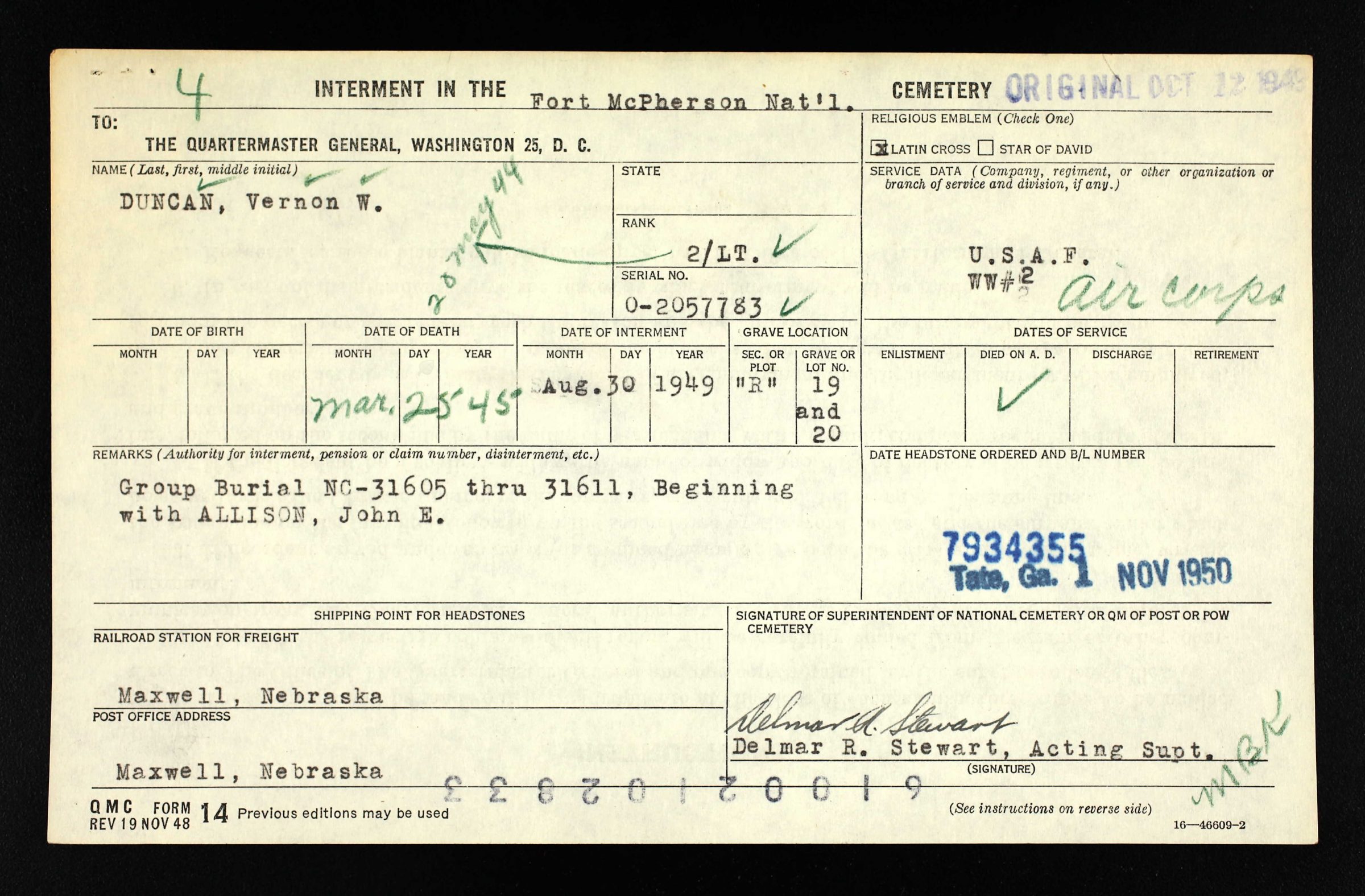 Group Burial with six other crew members at the Ft. McPherson National Cemetery, Nebraska.