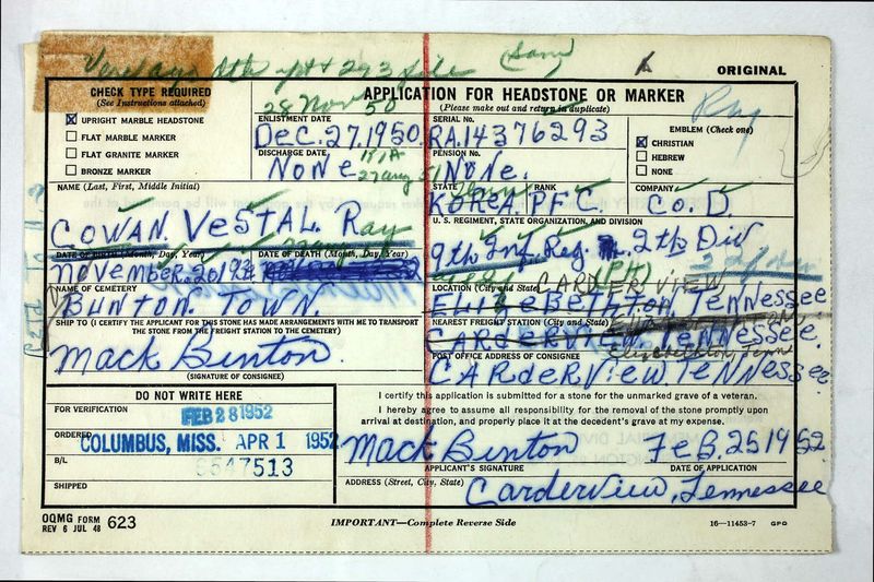 Carderview – The body of Private First Class Vestal R. Cowan, who was killed in action in Korea August 27, will arrive in Johnson City Tuesday morning. He was the son of R.L. Cowan, Bridgeport, Ala. Cowan enlisted in the Army on November 27, 1950, and received his basic training at Fort Jackson, S.C., and Camp Stoneman, Calif. He went overseas on June 9, 1951 and served with Company D, Ninth Infantry Regiment of Second Division.