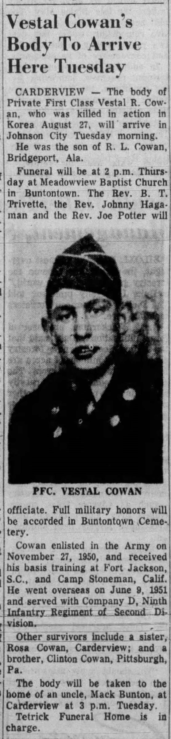 Carderview – The body of Private First Class Vestal R. Cowan, who was killed in action in Korea August 27, will arrive in Johnson City Tuesday morning. He was the son of R.L. Cowan, Bridgeport, Ala. Cowan enlisted in the Army on November 27, 1950, and received his basic training at Fort Jackson, S.C., and Camp Stoneman, Calif. He went overseas on June 9, 1951 and served with Company D, Ninth Infantry Regiment of Second Division.