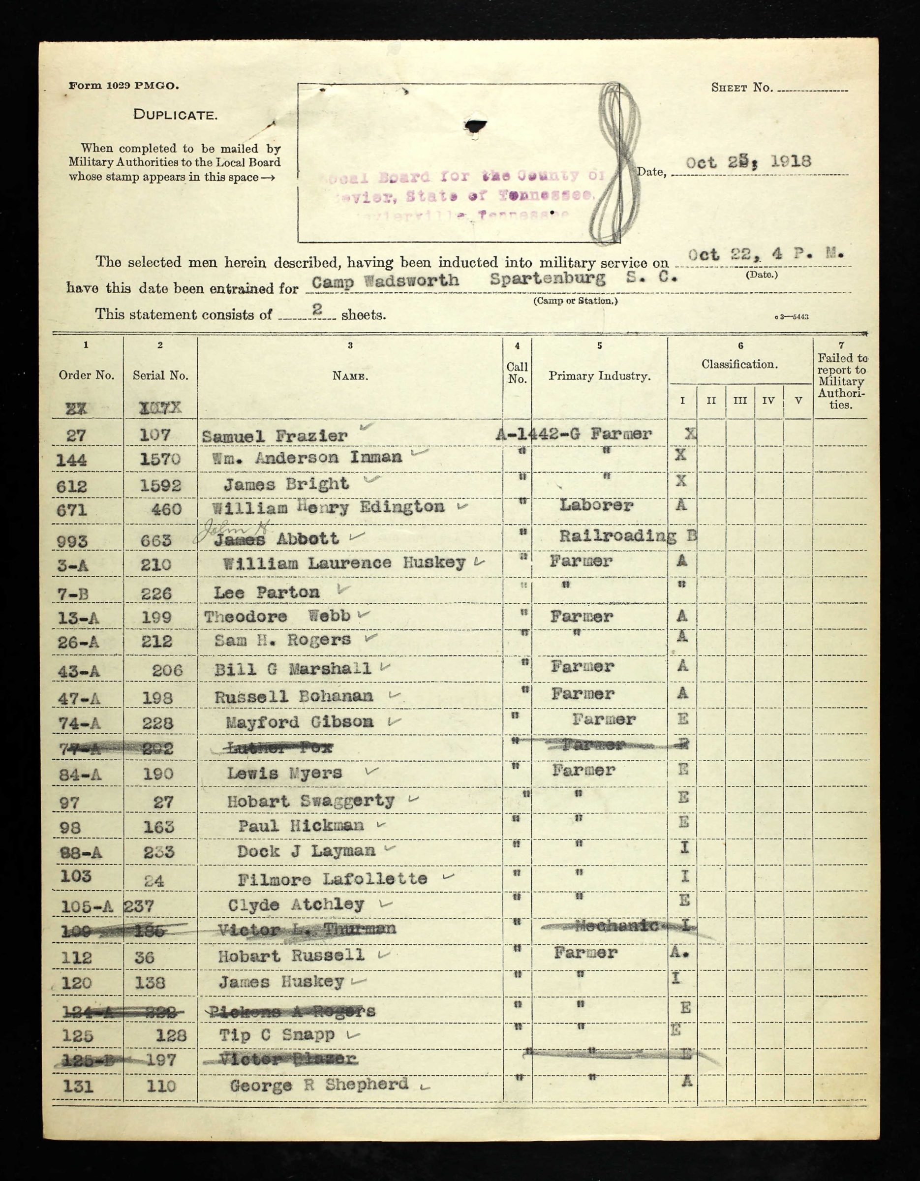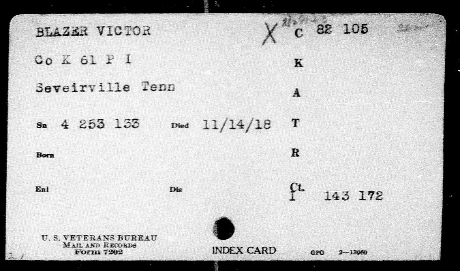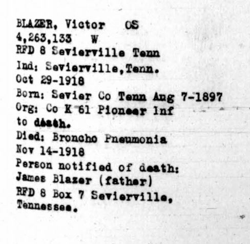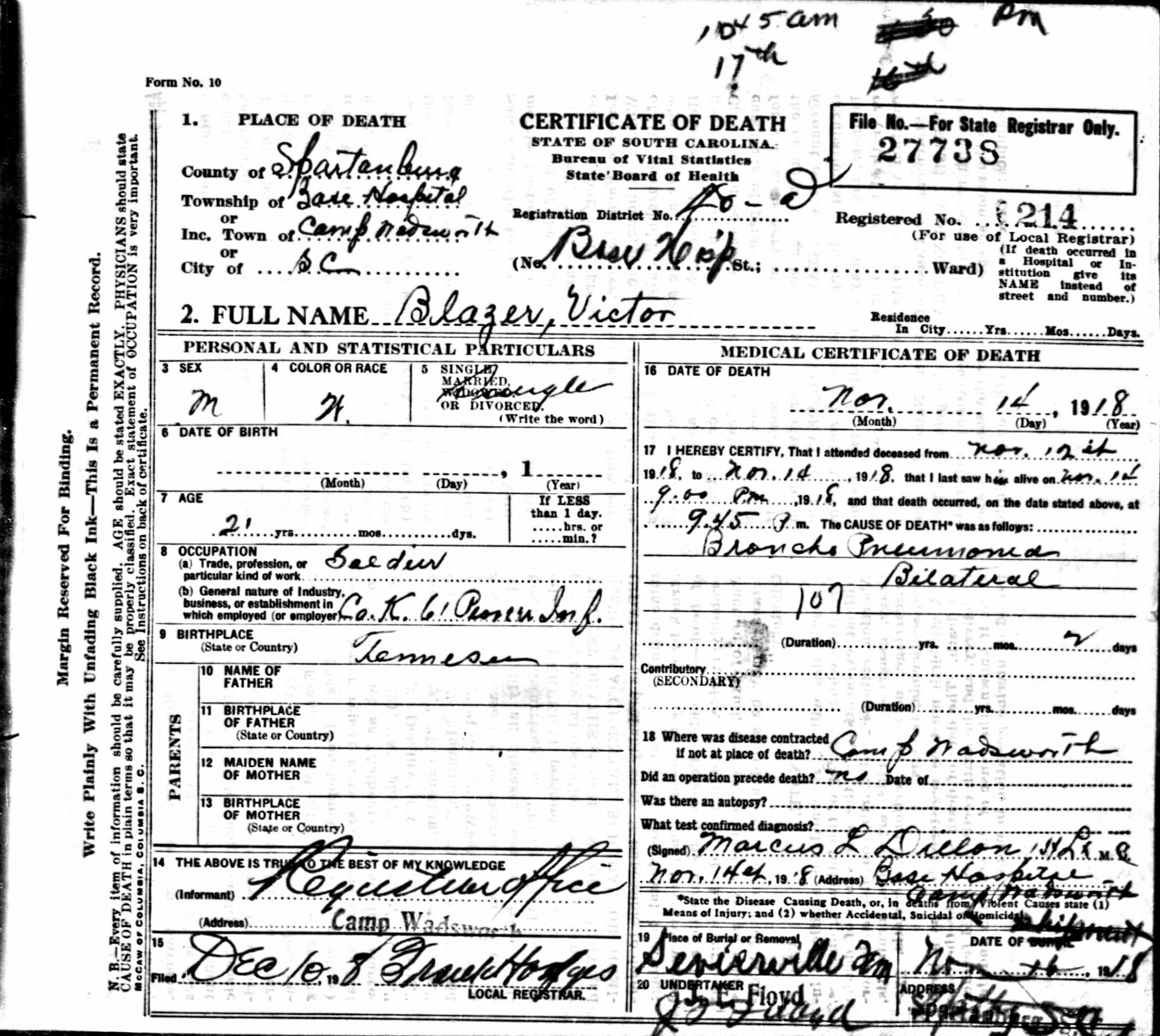 Victor Blazer died 14 November 1918 at the base hospital at Camp Wadsworth in Spartanburg County, South Carolina. He died of Bronchial Pneumonia Bilateral.