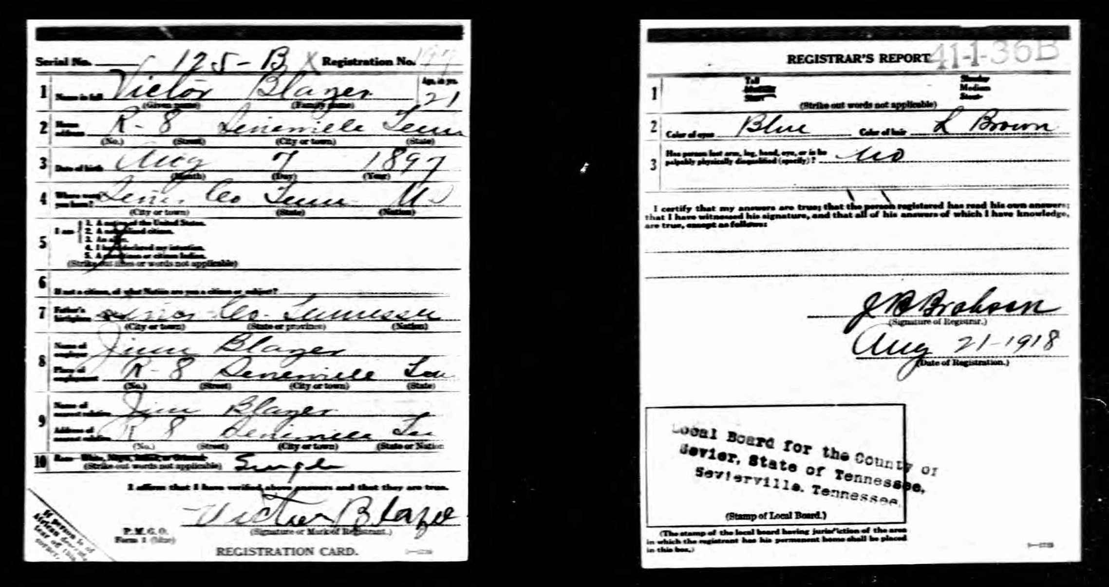 George Victor Blazer was born 7 August 1897 in Sevier County, Tennessee, son of James Caswell Blazer and Margaret Emmaline Atchley