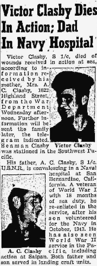Victor Clasby, S 1/c, died of wounds received in action at sea, according to information received by his mother, Mrs. A.O. Clasby, 1622 Highland Street, from the War Department Wednesday afternoon. Further information will be sent to the family later, the telegram indicated. Seaman Clasby was stationed in the Southwest Pacific. His father, A.C. Clasby, S 1/c, U.S.N.R. is convalescing in a Naval hospital at San Bernardino, California. A veteran of World War I with 18 months of sea duty, he re-enlisted in the service, after his son volunteered for the Navy in October 1943. He has also seen World War II service in the Pacific, including action at Saipan. Both father and son served in landing craft units.
