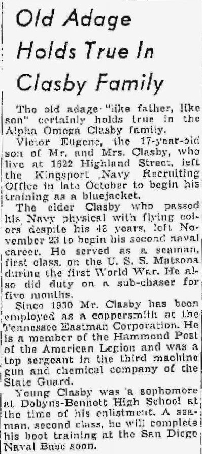 The old adage ‘like father, like son’, certainly holds true in the Alpha Omega Clasby family. Victor Eugene, the 17-year-old son of Mr. and Mrs. Clasby, who lived at 1622 Highland Street, left the Kingsport Navy Recruiting Office in late October to begin his training as a bluejacket. The elder Clasby who passed his Navy physical with flying colors despite his 43 years, left November 23 to begin his second naval career. He served as a seaman first class, on the U.S.S. Matsona during the first World War. He also did duty on a sub-chaser for five months. Since 1930 Mr. Clasby has been employed as a coppersmith at the Tennessee Eastman Corporation. He is a member of the Hammond Post of the American Legion and was a top sergeant in the third machine gun and chemical company of the State Guard. Young Clasby was a sophomore at Dobyns-Bennett High School at the time of his enlistment. A seaman second class, he will complete his boot training at the San Diego Naval Base soon.