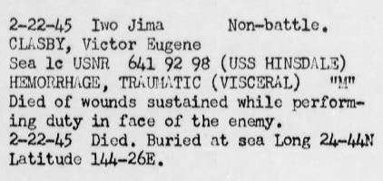 Served on the U.S.S. Hinsdale (APA 120) Died of wounds, Hemorrhage, traumatic (visceral) sustained while performing duty in face of the enemy. Buried at sea Longitude 24-44N, Latitude 144-26E. Son of Alpha Omega Clasby and Frances Bower Robinette