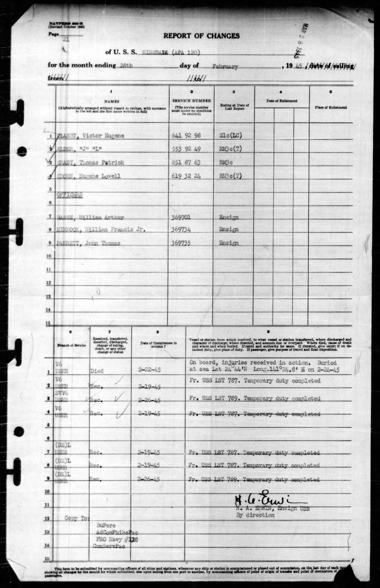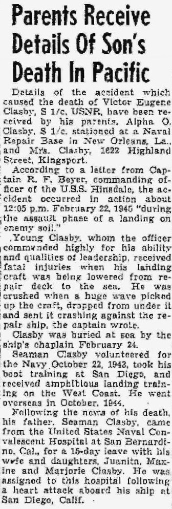 Details of the accident which caused the death of Victor Eugene Clasby, S 1/c, USNR, have been received by his parents, Alpha O. Clasby, S 1/c, stationed at a Naval Repair Base in New Orleans, La., and Mrs. Clasby, 1622 Highland Street, Kingsport. According to a letter from Captain R.F. Beyer, commanding officer of the USS Hinsdale, the accident occured in action about 12:05 p.m. February 22, 1945, during the assualt phase of a landing on enemy soil. Young Clasby, whom the officer commended highly for his ability and qualities of leadership, received fatal injuries when his landing craft was being lowered from repair deck to the sea. He was crushed when a huge wave picked up the craft, dropped from under it and sent it crashing against the repair ship, the captain wrote. Clasby was buried at sea by the ship’s chaplain February 24. Seaman Clasby volunteered for Navy, October 22, 1943, took his boot training at San Diego and received amphibious landing traning on the West Coast. He went overseas in October, 1944. Following the news of his death, his father, Seaman Clasby, came from the United States Naval Convalescent Hospital at San Bernardino, Cla., for a 15-day leave with his wife and daughters, Juanita, Maxine and Marjorie Clasby. He was asssigned to this hospital following a heart attack aboard his ship at San Diego, Calif.