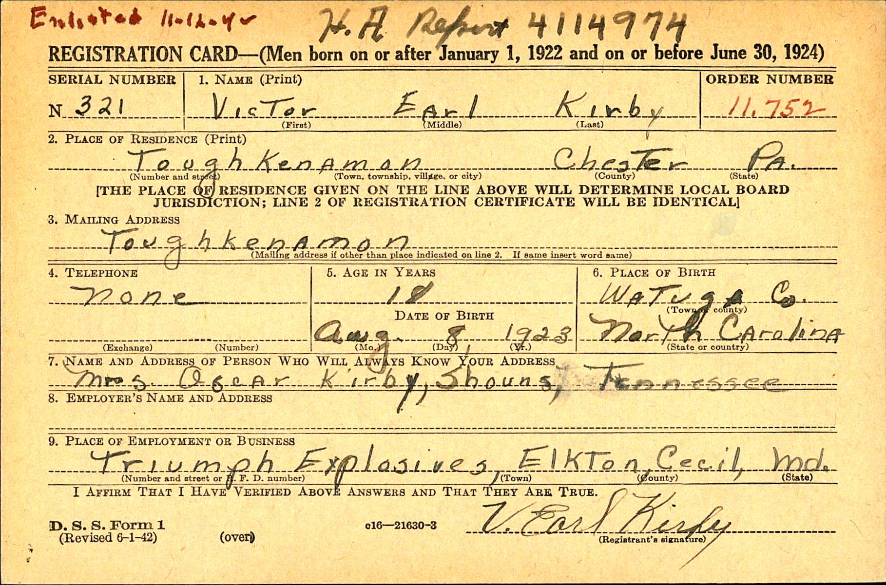 Victor Earl Kirby was born in Watauga, North Carolina, the son of Oscar Shafter Kirby and Tabitha Mae Roberts.