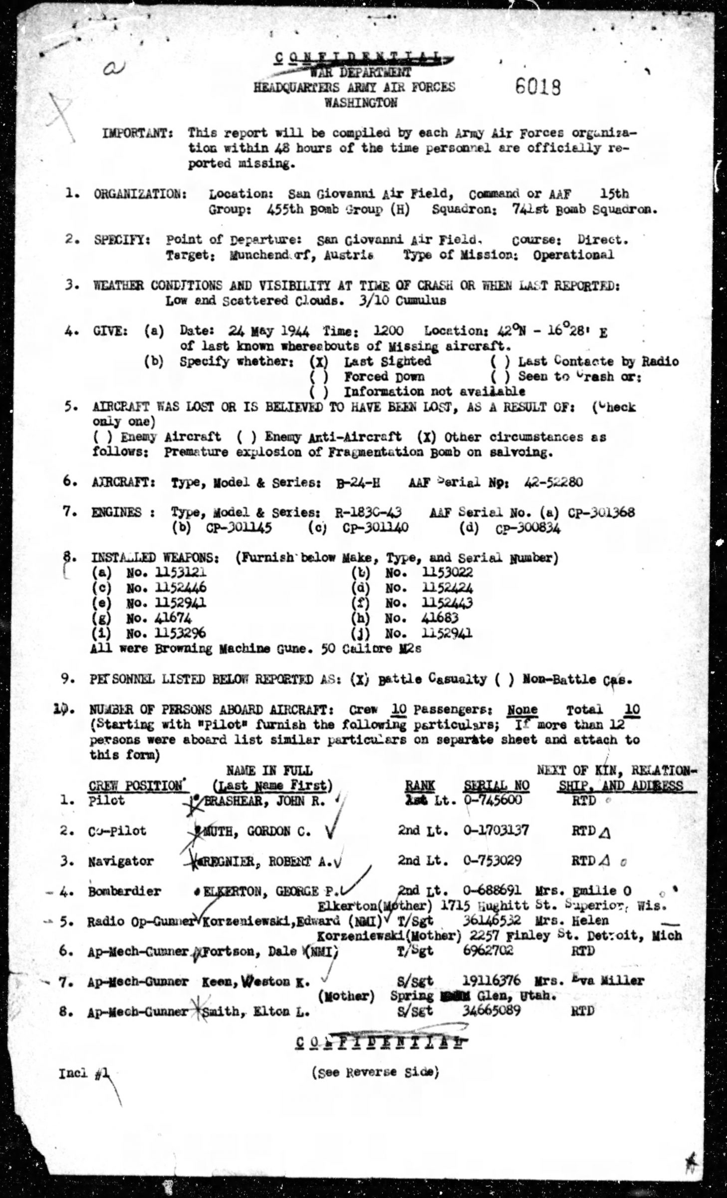 Aircraft B-24H with serial number 42-52280 departed from San Giovanni Air Field on a operational mission to Münchendorf in Austria. The aircraft suffered a flak hit in the number one engine. They remained in formation for a while and the airplane, with the crippled engine throwing oil, did not bomb with the group. The ship made its way back to the Adriatic Sea where the bomb load was dropped to insure a safe landing when they would reach their base. One of the bombs exploded prematurely a few feet below the plane, so severely damaging the ship that it was forced to make a crash landing into the sea. The force of the impact of the crash caused the plane to break in two.