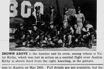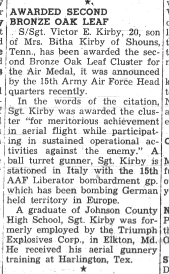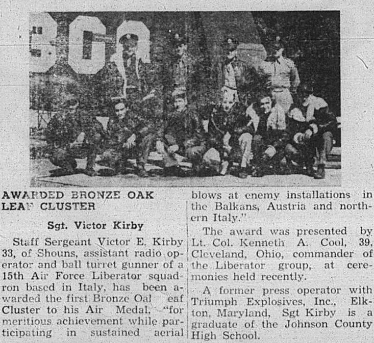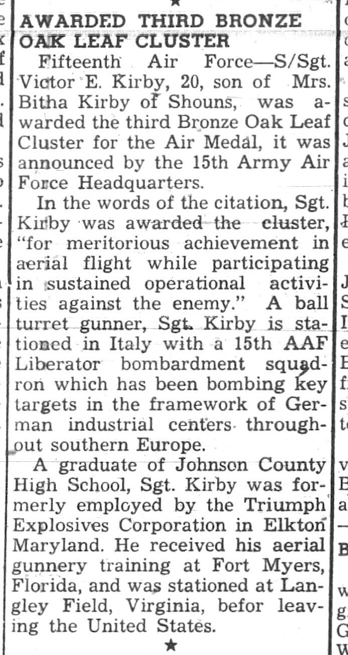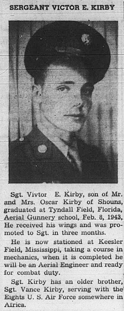 Sgt. Victor E. Kirby, son of Mr. and Mrs. Oscar Kirby of Shouns, graduated at Tyndall Field, Florida, Aerial Gunnery school, Feb. 8, 1943. He received his wings and was promoted to Sgt. In three months.