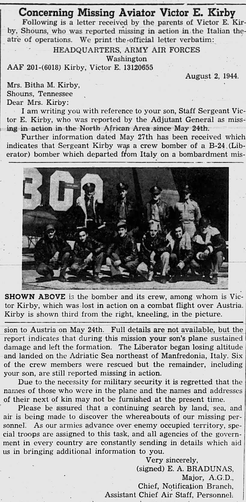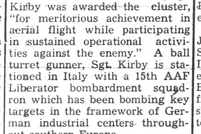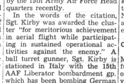 He is now stationed at Keesler Field, Mississippi, taking a course in mechanics, when it is completed he will be an Aerial Engineer and ready for combat duty. Sgt. Kirby has an older brother, Sgt. Vance Kirby, serving with the Eight U.S. Air Force somewhere in Africa.