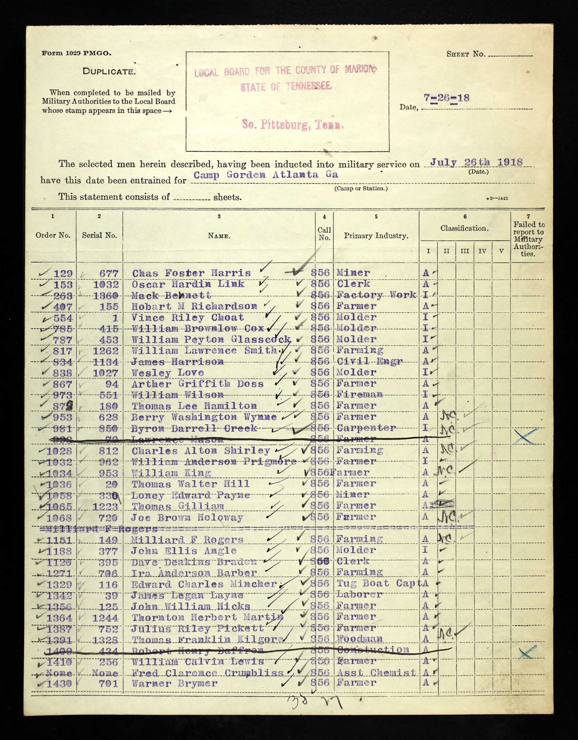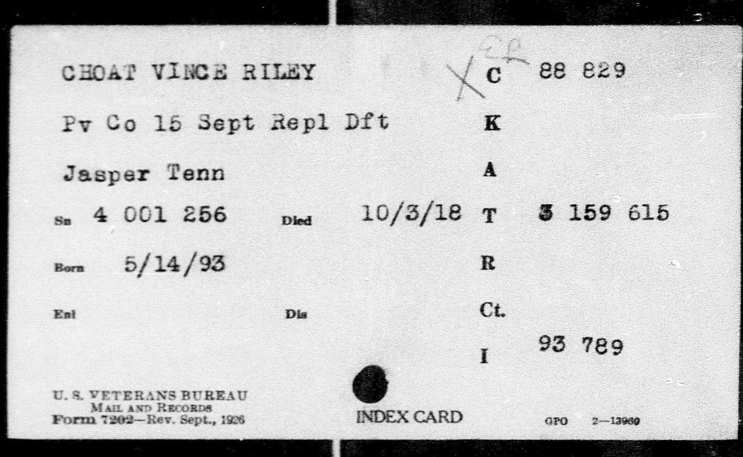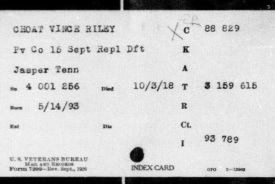 Private Vince Riley Choat (also spelled as Choate) was born 14 May 1893 to Thomas M Choat and Hariett Tennessee Howard. He was a molder before his induction into military service on 26 July 1918 at Camp Gorden, Atlanta, Georga. He died 3 October 1918, Devonshire, England.