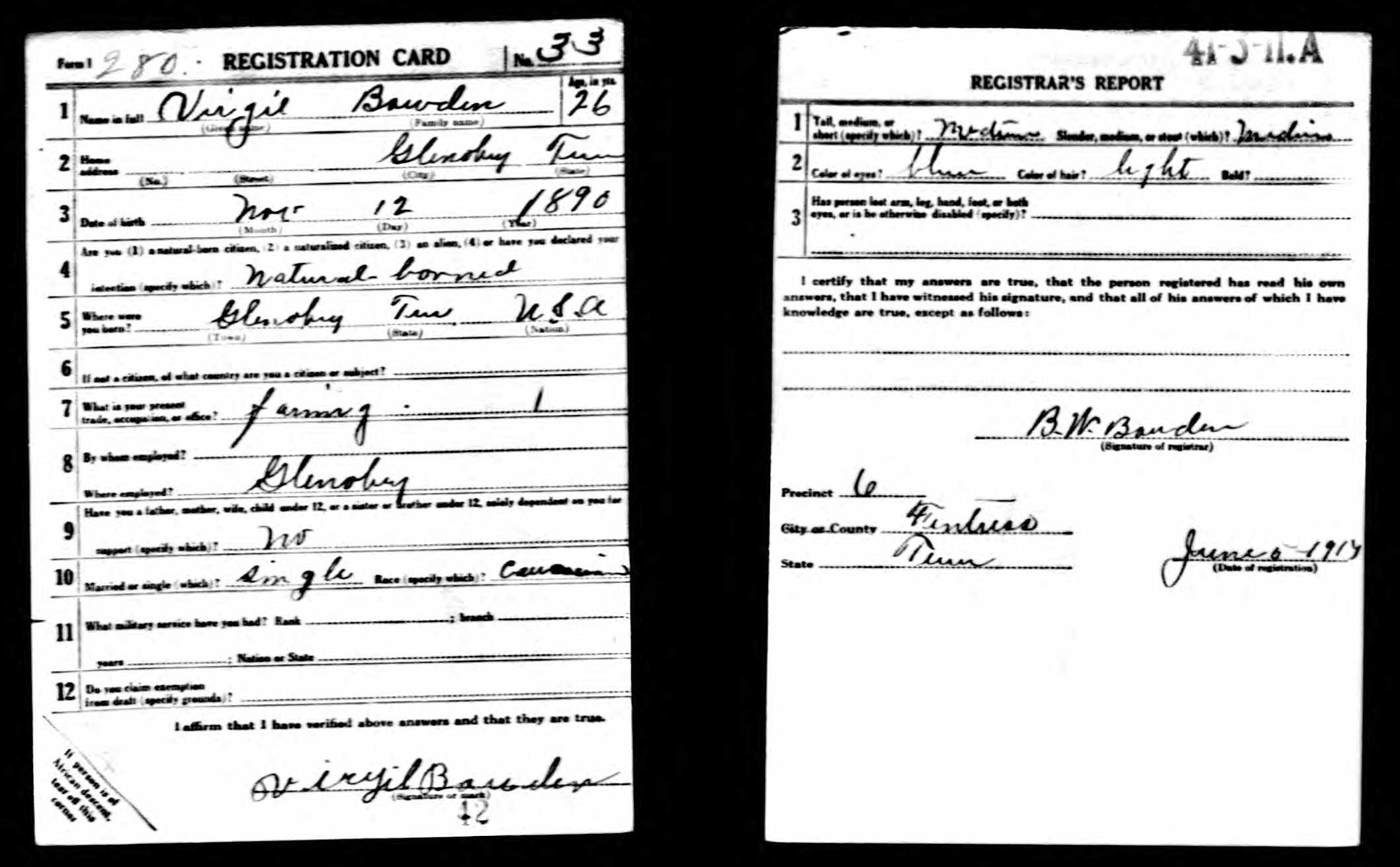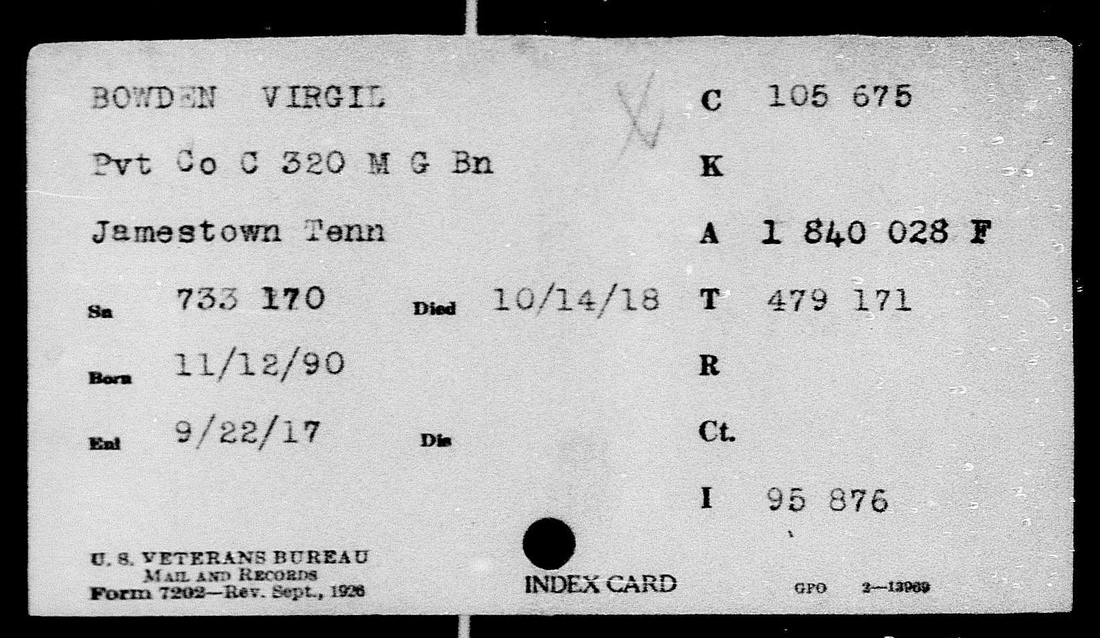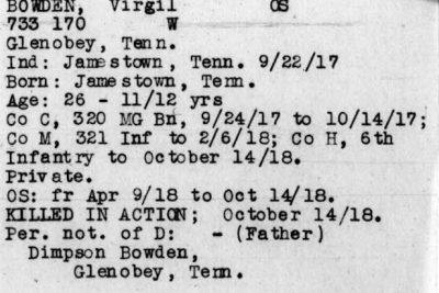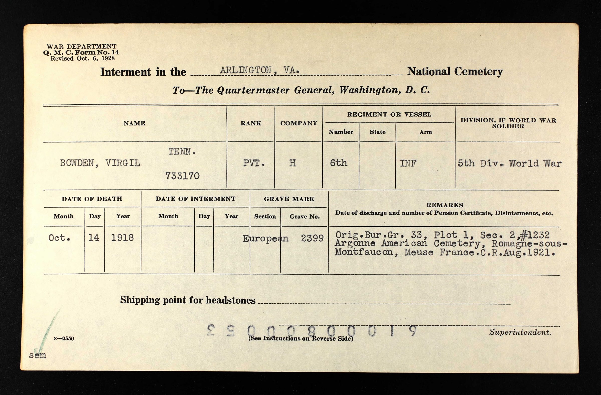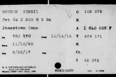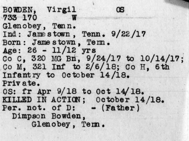 Virgil Bowden was born 12 November 1890 in Jamestown, Tennessee. He served in Company H, 6th Infantry. He was killed in action on October 14, 1918 in France and initially buried at the American Cemetery Romagne-sous-Montfaucon, Meuse, France. He is buried in Arlington National Cemetery (Section 18, Site 2399).