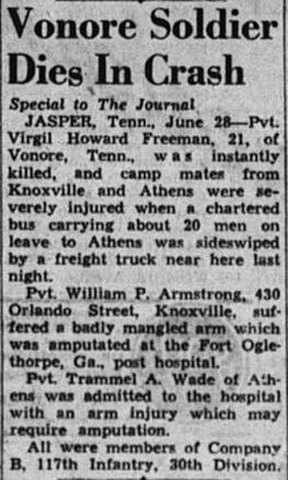 Virgil Dee Howard Freeman, son of Jordan Dee Oscar Freeman and Rillia Long, was accidentally killed in a bus accident Saturday night. The young man was coming home on furlough from Camp Jackson, S.C. to visit his parents. The bus by some means was hit by a freight car. He was buried at Holly Springs Cemetery Monday.