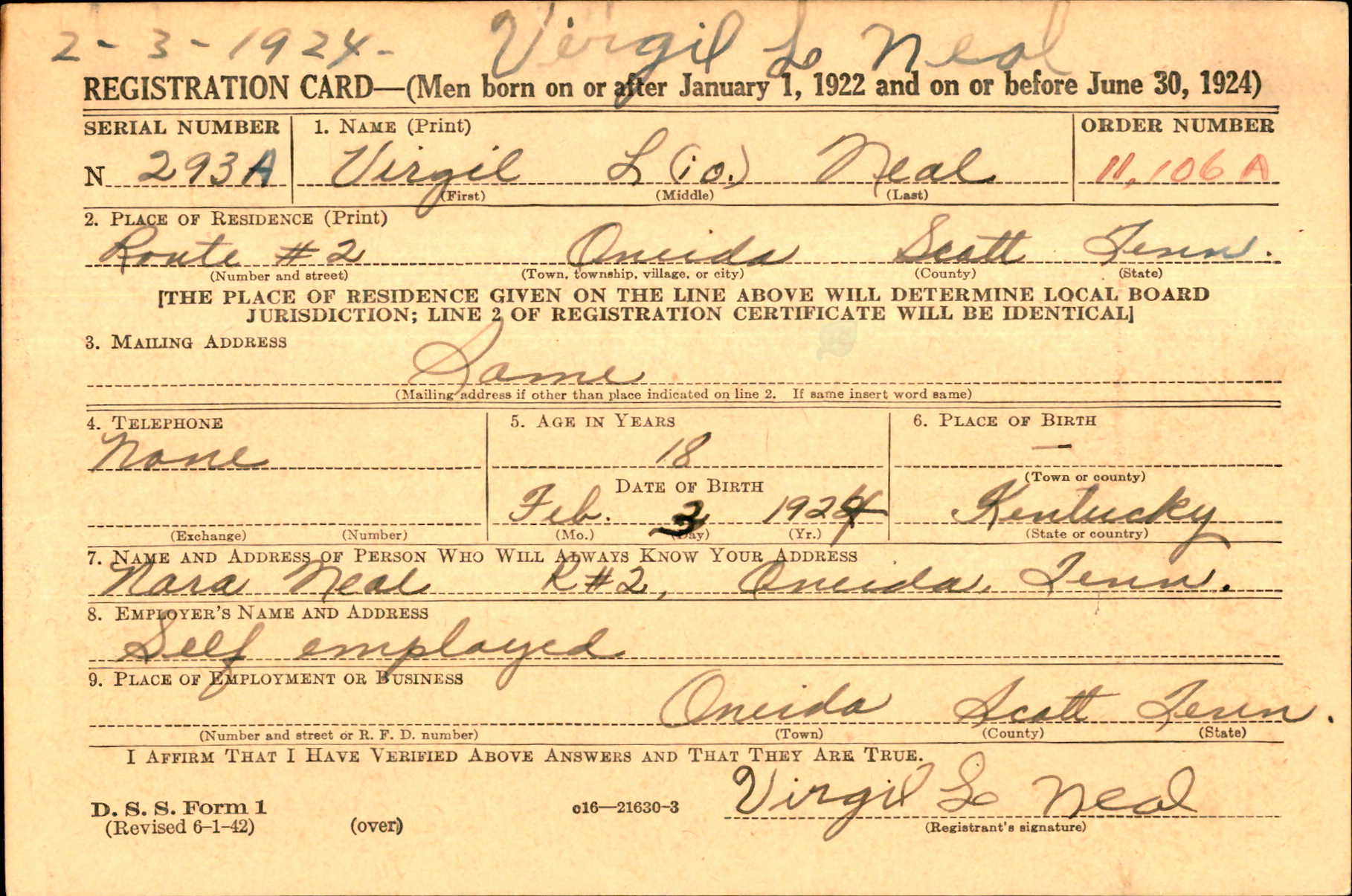 Virgil Neal was born in McCreary, Kentucky, the son of James Benjamin “Benny” Neal and Nara Williams.