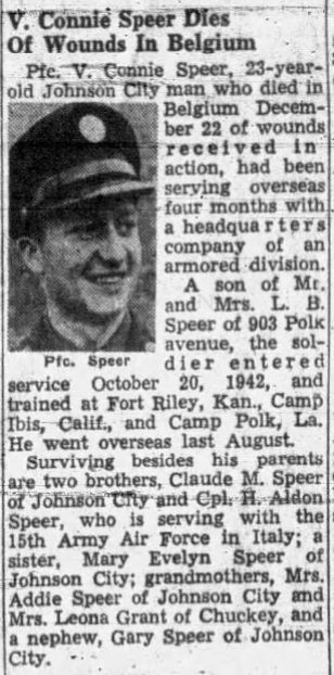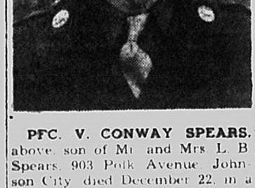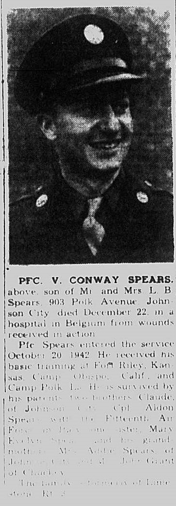 Pfc. V. Conway Spears, son of Mr. and Mrs. L.B. Spears, 903 Park Avenue, Johnson City, died December 22 in a hospital in Belgium from wounds received in action. Pfc. Spears entered the service October 20, 1942. He received his basic training at Fort Riley, Kansas, a Camp in California and Camp Polk.