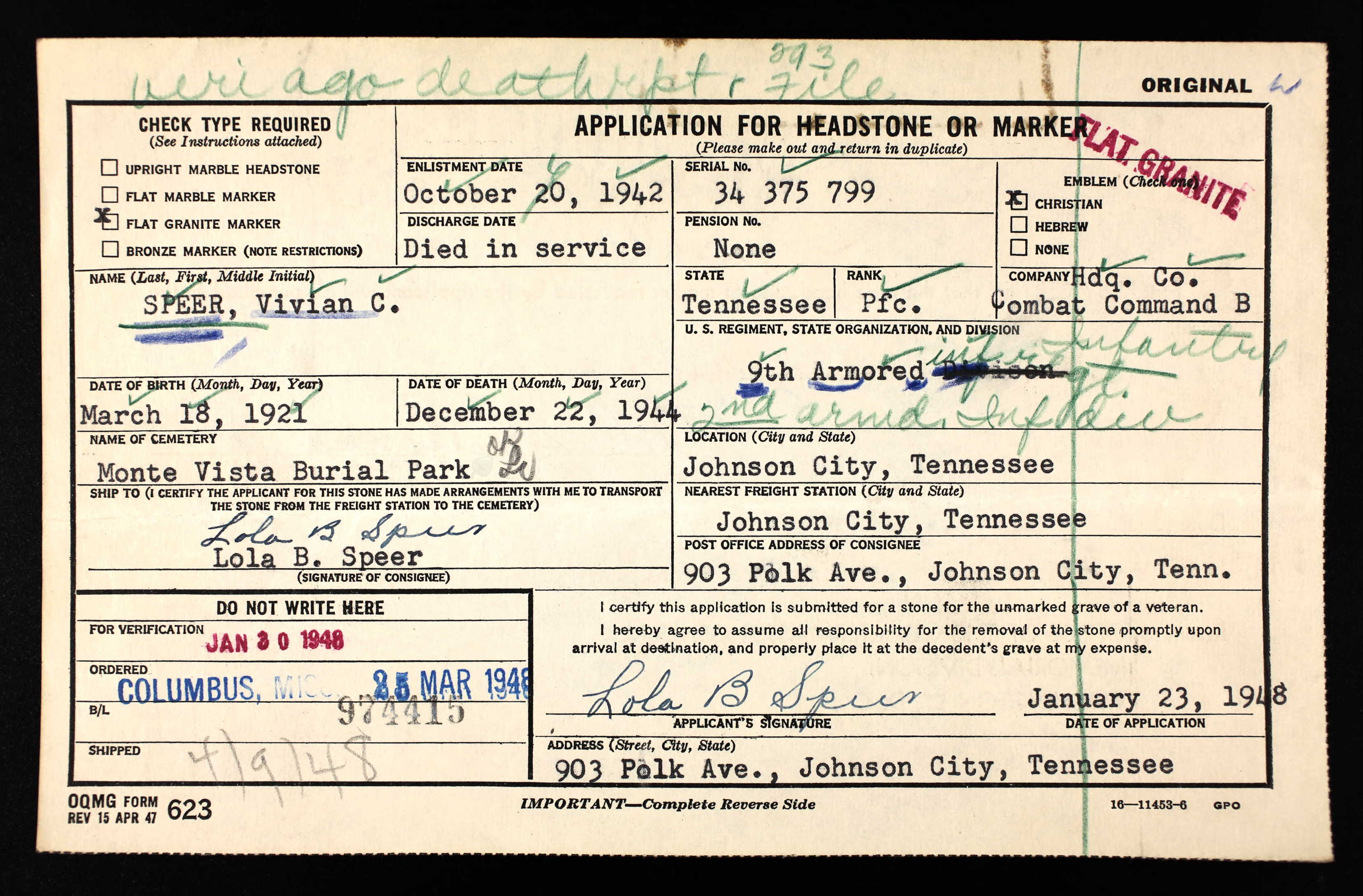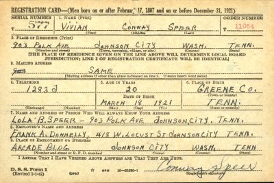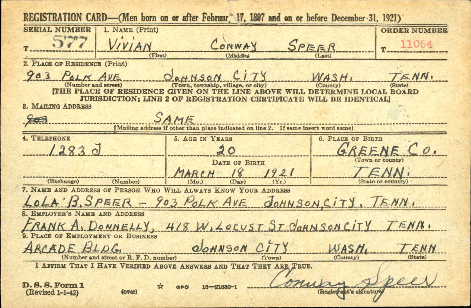 Vivian Conway (Connie) Speer was born on 18 March 1921, Tennessee. Son of Lola Buford Speer and Lillie Alice Grant of 903 Polk Avenue, Johnson City. Brother of Claude Milton, Hubert Aldon and Mary Evelyn Speer.