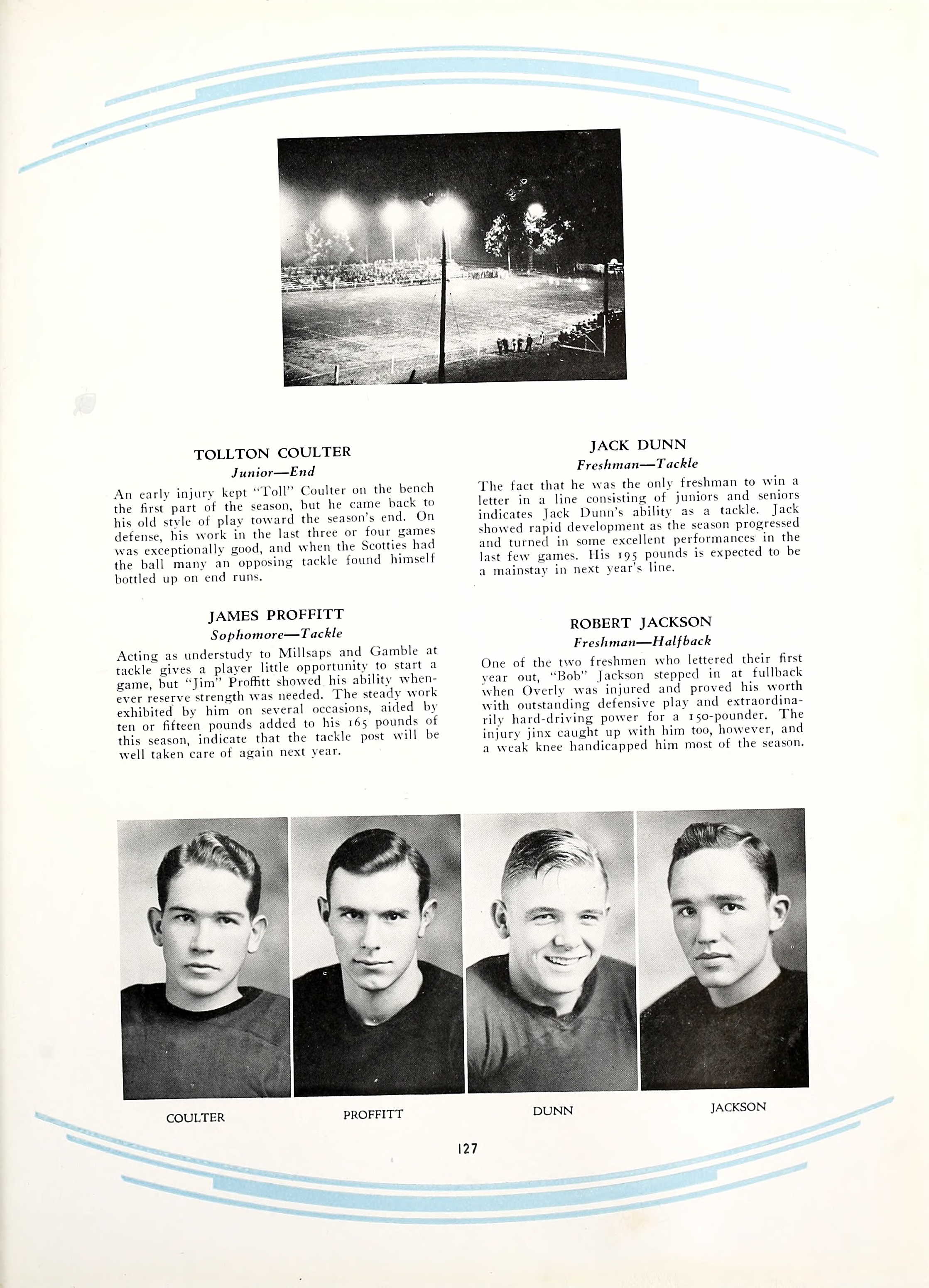 He was described in the 1936 Chilhowean football pages as follows: “The fact that he was the only freshman to win a letter in a line consisting of juniors and seniors indicates Jack Dunn’s ability as a tackle. Jack showed rapid development as the season progressed and turned in some excellent performances in the last few games. His 195 pounds is expected to be a mainstay in next year’s line.” He is also the son of William Claude Dunn Sr. who attended Maryville College as a Junior Class Preparatory Department student for two years (1897-1899).