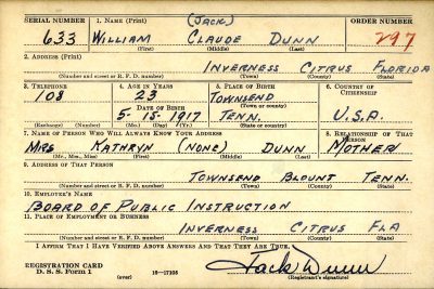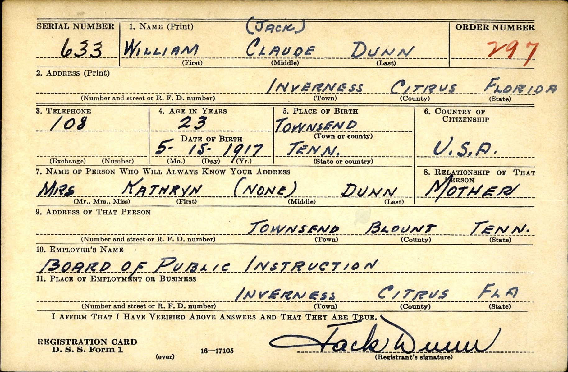 William Claude “Jack” Dunn Jr., was the son of Claude Dunn and Kathryn Dykes. He died at Lakehurst, Ocean County, New Jersey. During training exercises, his plane struck an air pocket and collided with the hanger where he was training (according to Dr. Lloyd’s remarks on 9 June 1945).