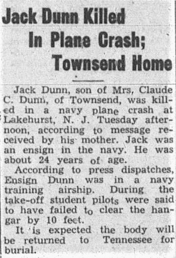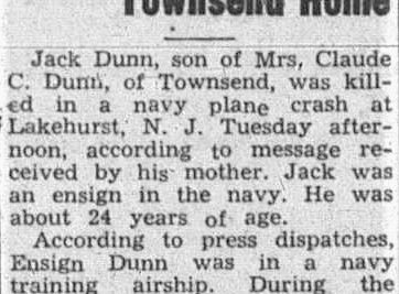 Jack Dunn, son of Mrs. Claude C. Dunn, of Townsend, was killed in a navy plane crash at Lakehurst, N.J. Tuesday afternoon, according to message received by his mother. Jack was an ensign in the navy. He was about 24 years of age. According to press dispatches, Ensign Dunn was in a navy training airship. During the take-off student pilots were said to have failed to clear the hangar by 10 feet.