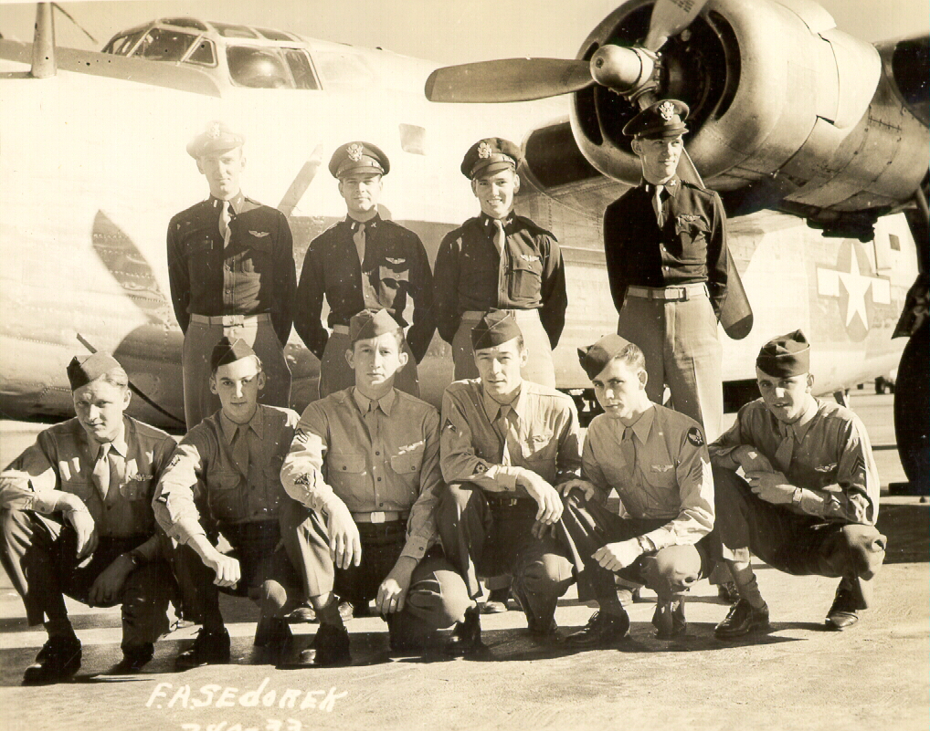 Photo of James Edward Thornton’s crew during WWII. 858th Bomb Group, 492nd Squadron, The Carpetbaggers. Back row from left – Francis Sidorek, Pilot; George Villforth, Co-Pilot; Lloyd Benton, Bombardier; and William Lee, Navigator. Front row from left – James E. Thornton, Martin Gun; Thomas Beverly, Jr, Sperry Gun; Sam Thomas, Radio Operator; Richard Gibson, Engineer; James Watkins, Tail Gun; and