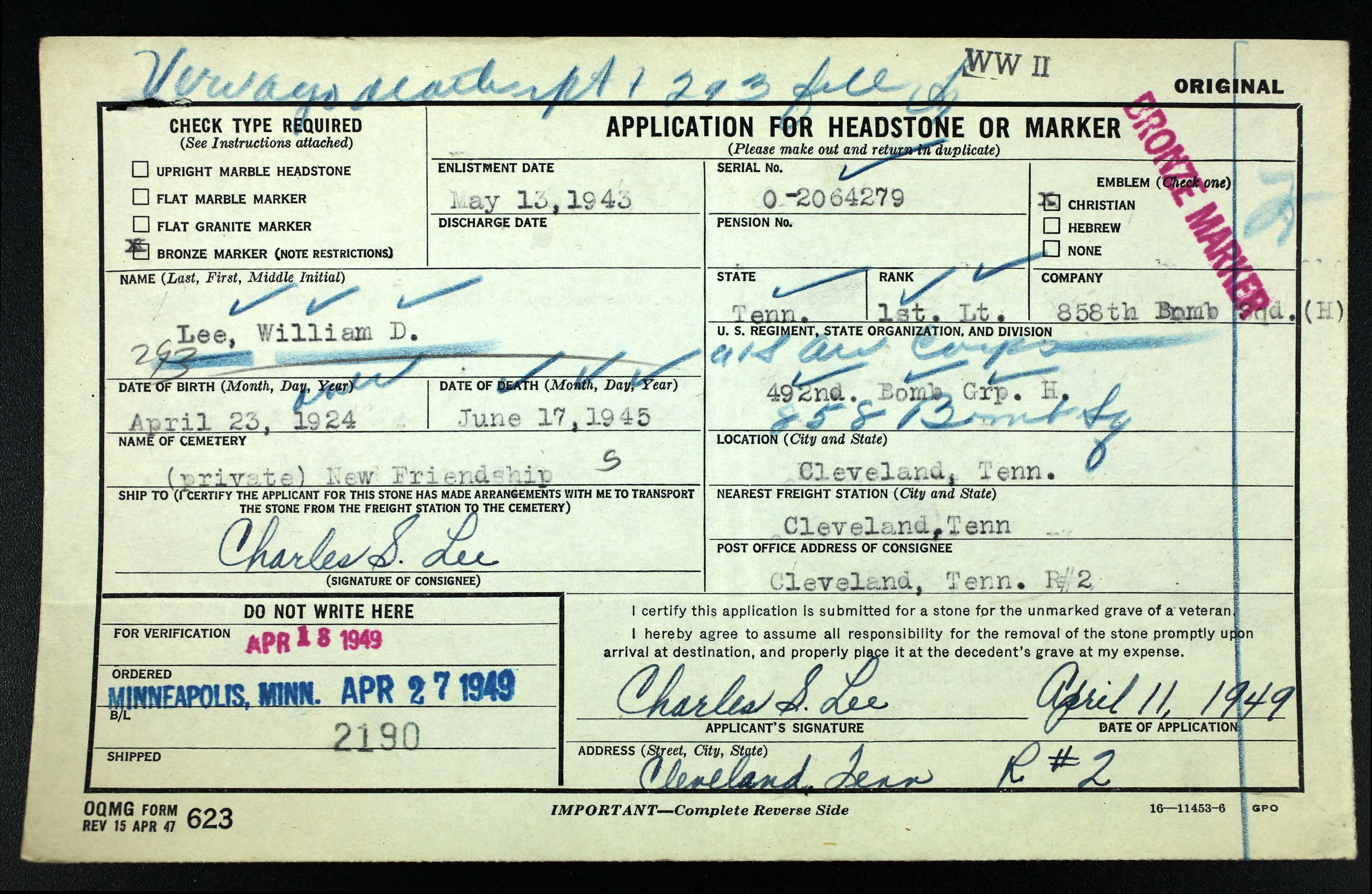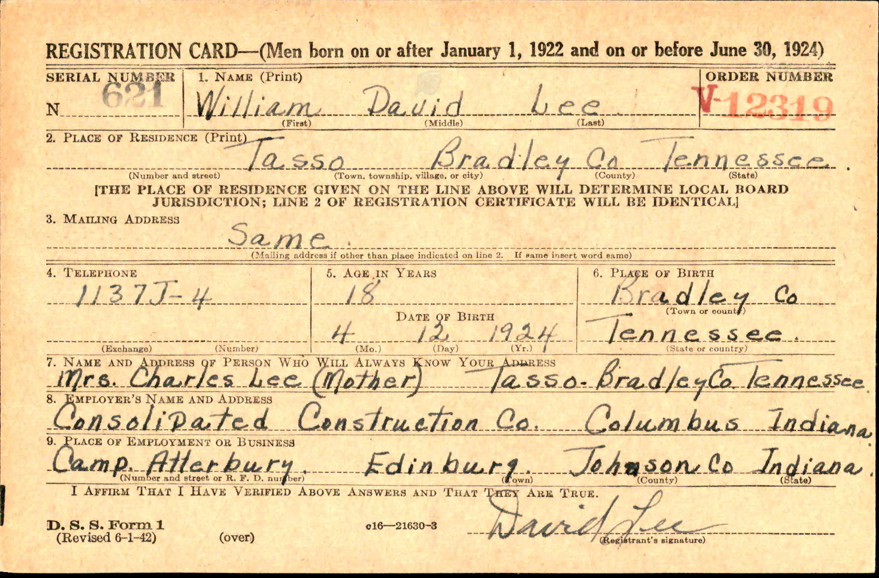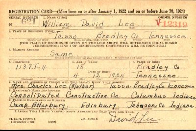 William David Lee was born on 23 April 1924. He was the son of Charles Spurgeon Lee and Maude Estell Hensley.