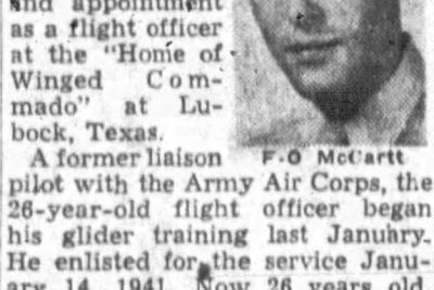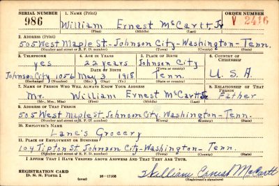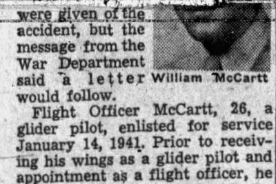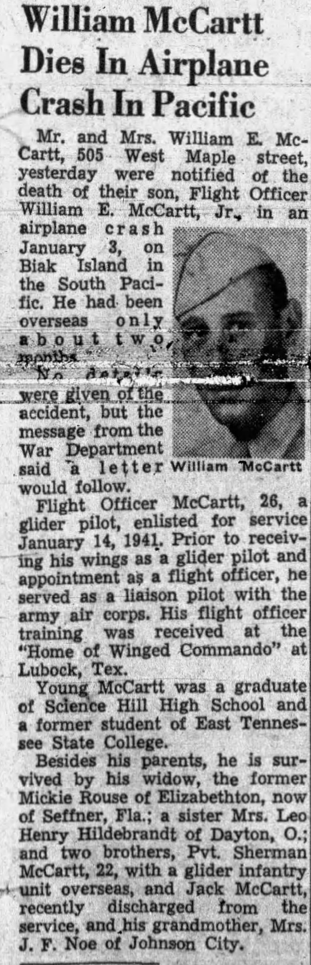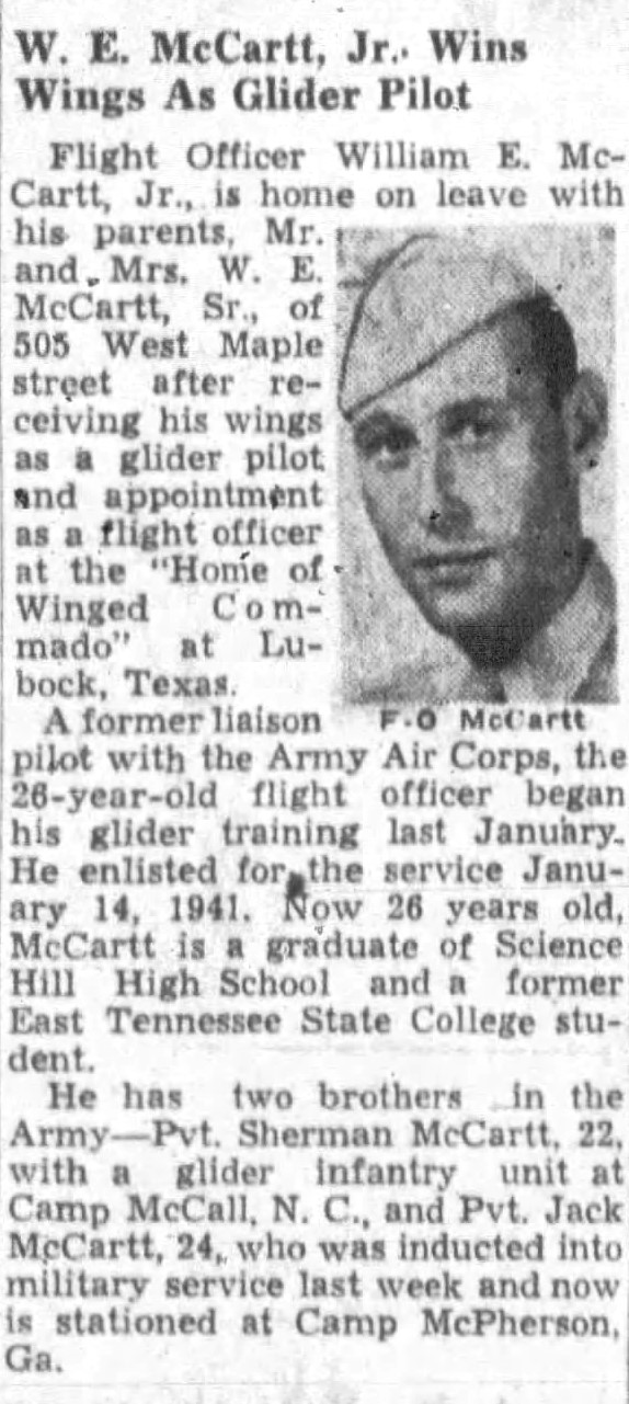 Bill’s the son of William Ernest McCartt and Emma L. Noe. He was married to Mickie Rouse of Elizabethton, Carter County, Tennessee. Bill’s two younger brothers: Sherman and Jack both served in the United States Army during World War II. Sherman was in a Glider Infantry Regiment.