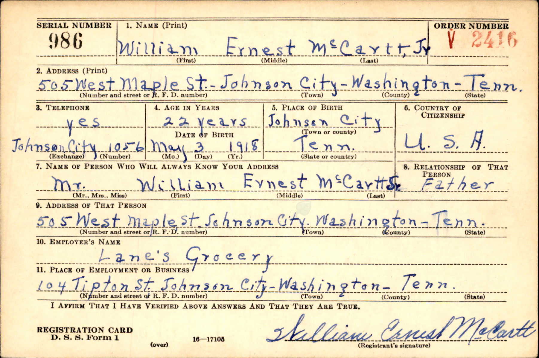 William “Bill” Ernest McCartt, Junior was born in Johnson City, Washington County, Tennessee on 3 May 1918. He graduated Science Hill High School, Class of 1936. Bill was in the Spanish Club and loved History and playing tennis. He later attended East Tennessee State College, also in Johnson City for two years prior to enlisting in the United States Army Air Corps on 14 January 1941.