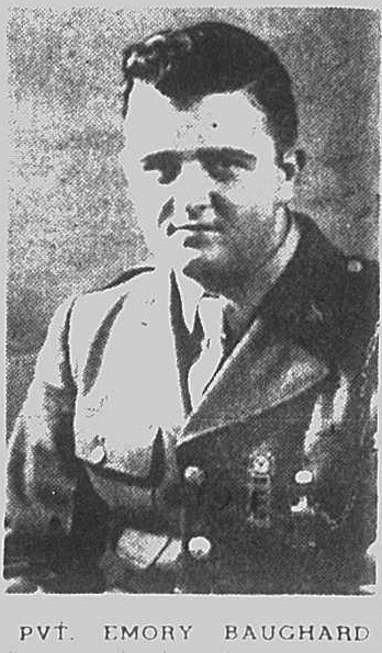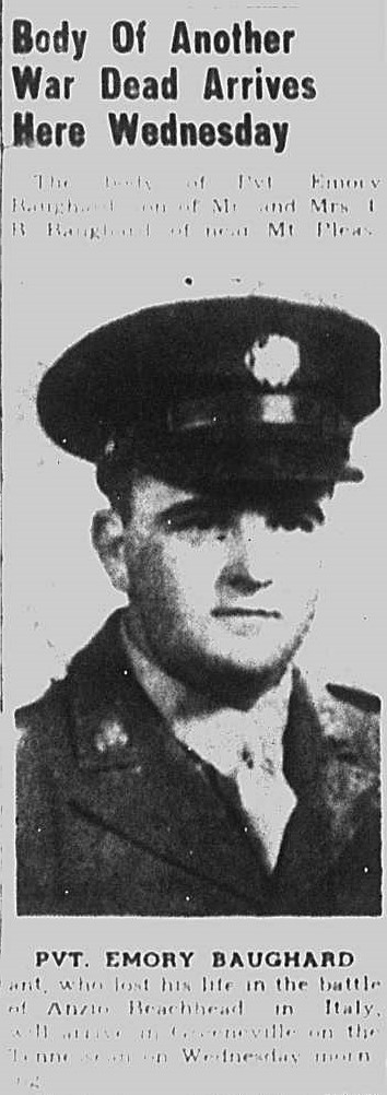 The body of Pvt. Emory Baughard, son of Mr. and Mrs. I.B. Baughard of near Mt. Pleasant, who lost his life in the battle of Anzio Beachhead in Italy, will arrive in Greeneville on the Tennessean on Wednesday morning.