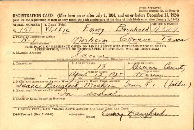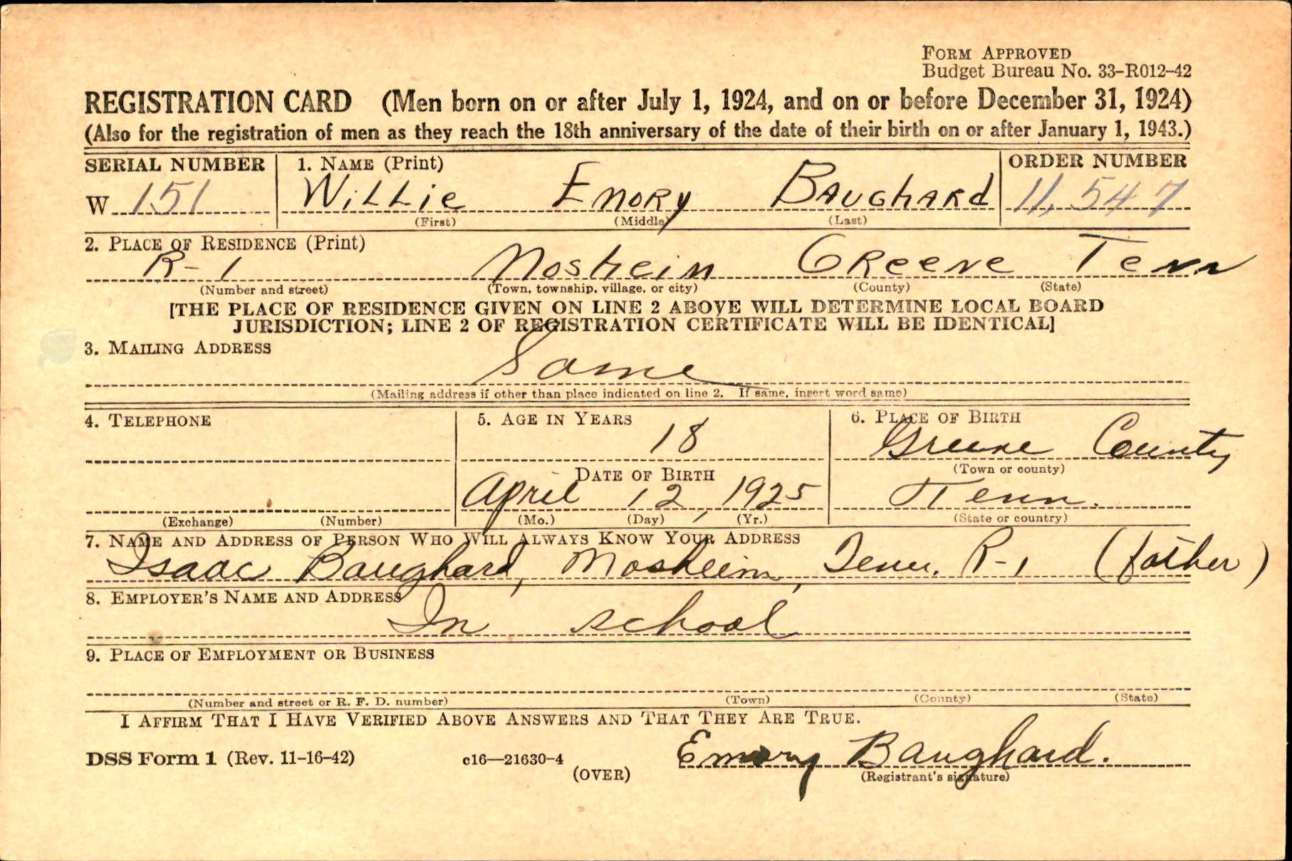 Willie Emory Baughard was born 12 April 1925 to Isaac Bonham Baughard and Oda Kelton. Brother of Don I. and Trula Baughard.