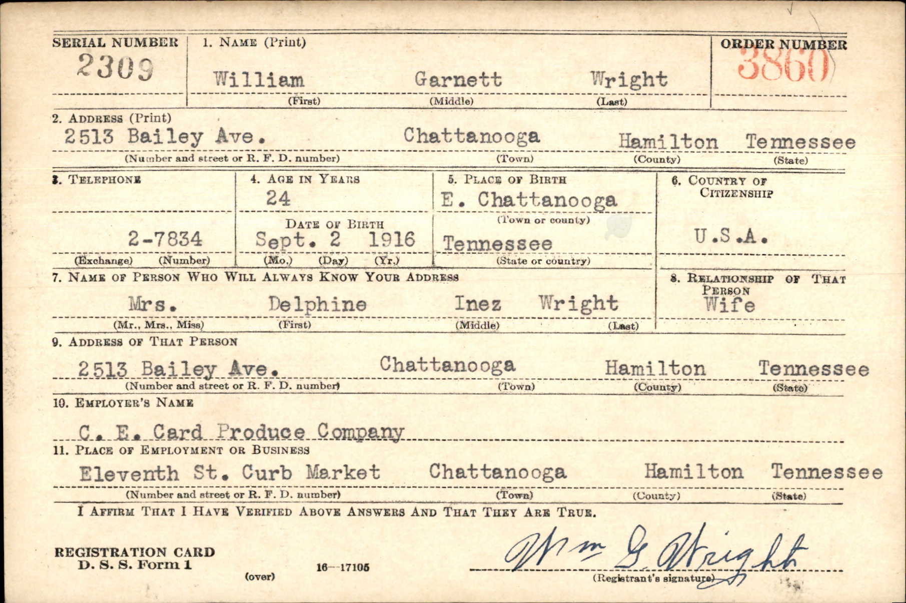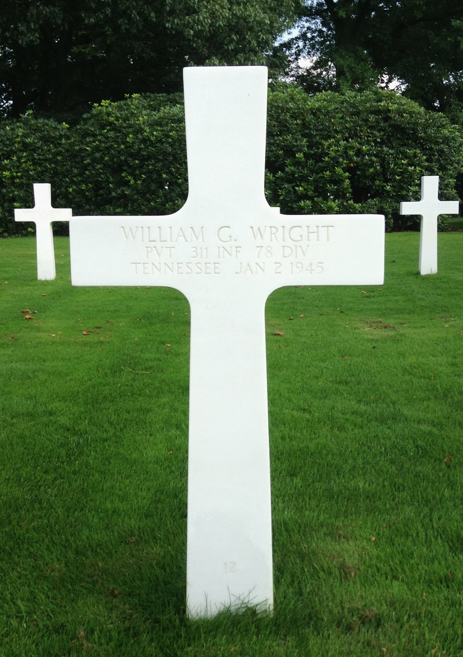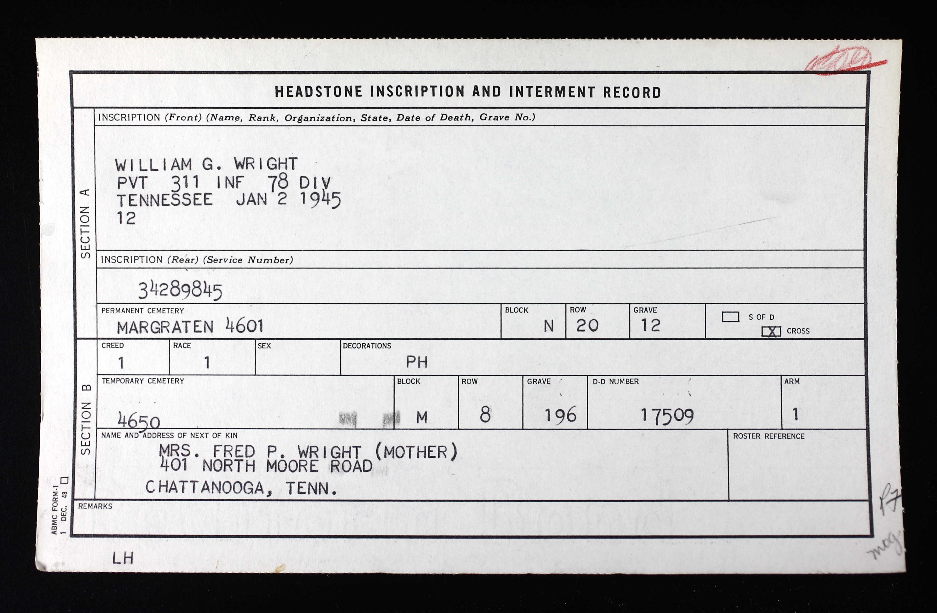 Private First Class William Garnett Wright 34289845 U.S. Army. Was born in 1916 in Tennessee. He was from Hamilton County and was the husband of Delphine Wright. They had a daughter Eleanor.