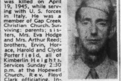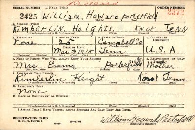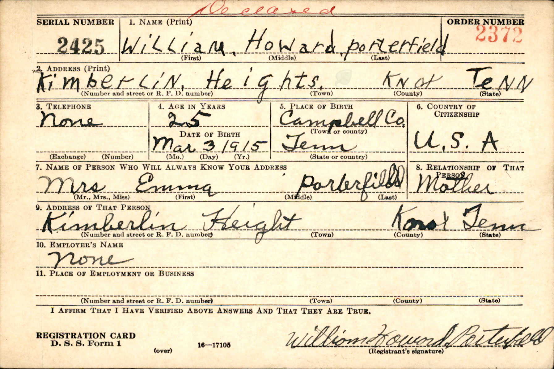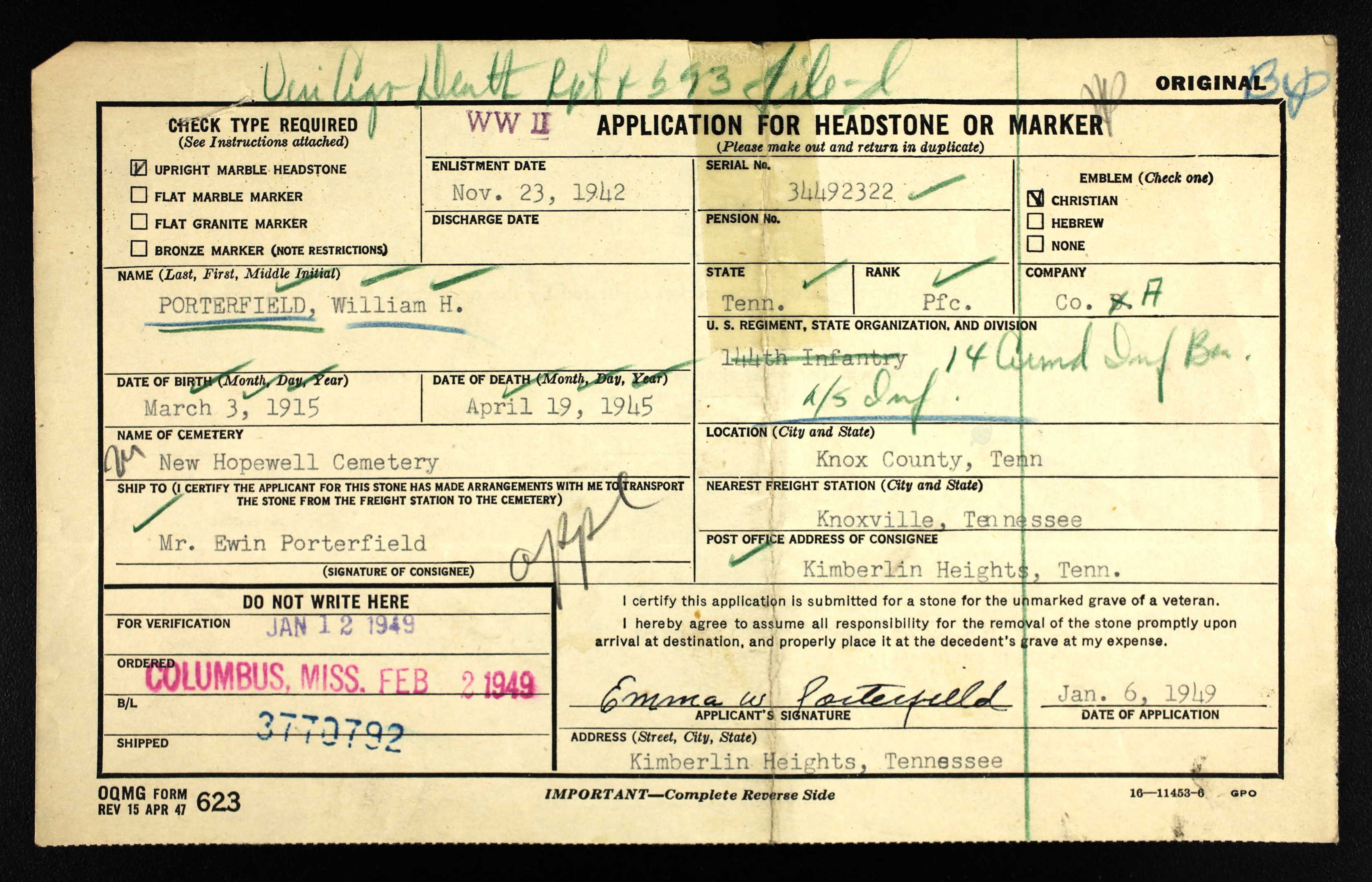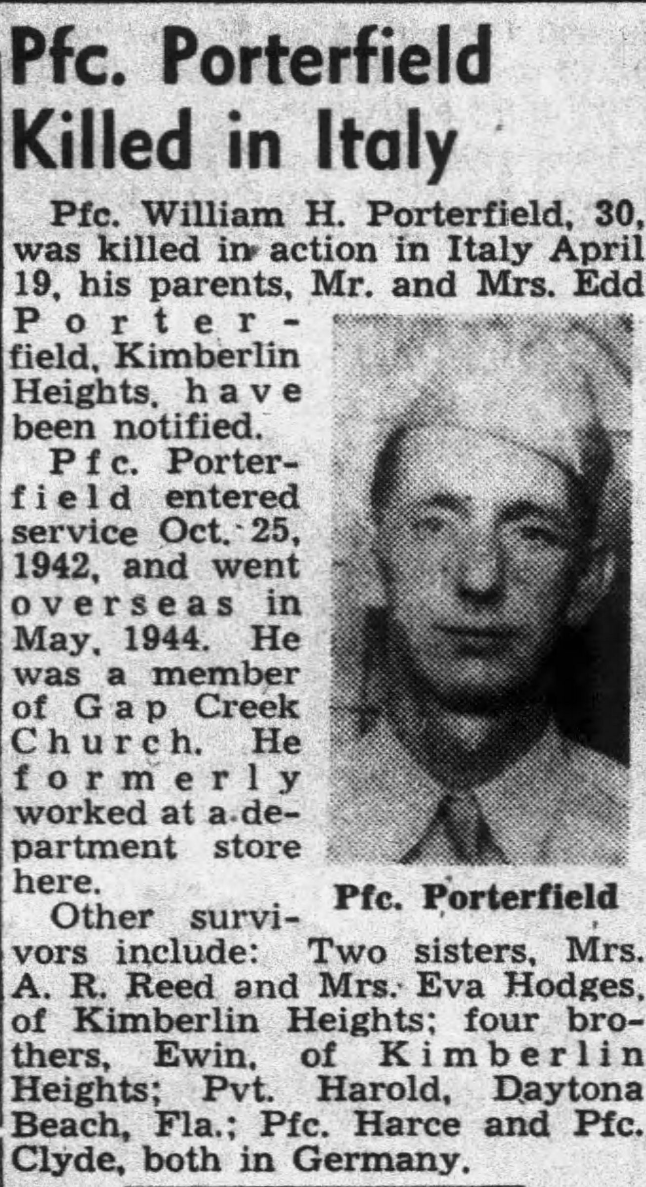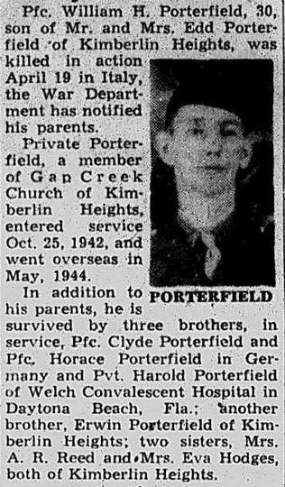 William Howard Porterfield was born in Campbell County, Tennessee. He was the son of William Edward ‘Edd’ Porterfield and Emma Welch. He enlisted on November 23, 1942, in Fort Oglethorpe, GA and went overeseas in May, 1944. He was killed in action in Italy.