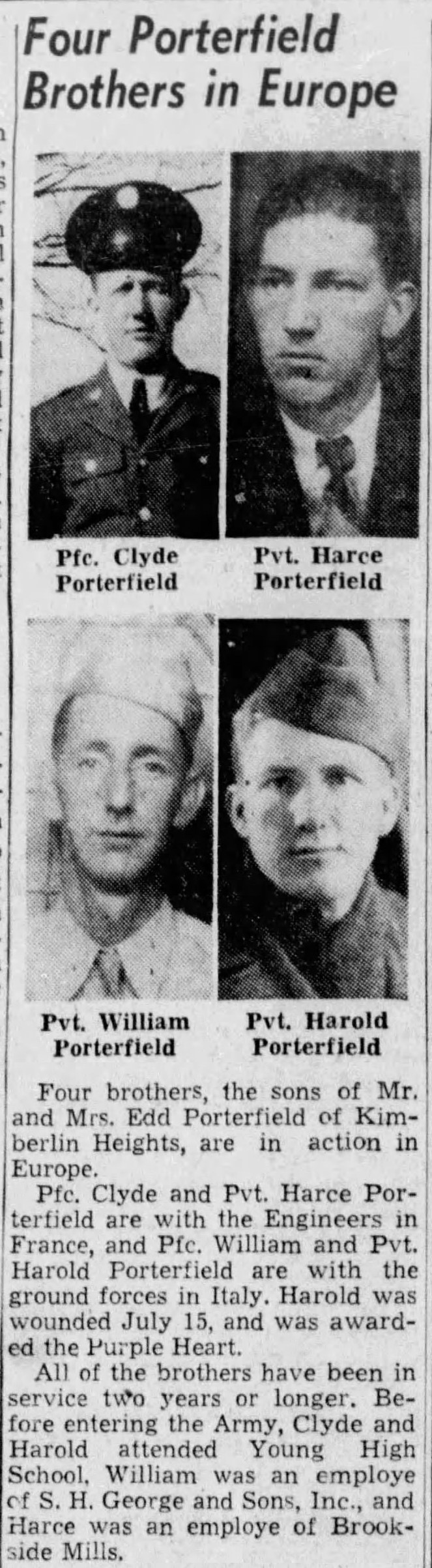 Four brothers, the sons of Mr. and Mrs. Edd Porterfield of Kimberlin Heights, are in action in Europe. Pfc. Clyde and Pvt. Harce Porterfield are with the Engineers in France, and Pfc. William and Pvt. Harold Porterfield are with the ground forces in Italy. Harold was wounded July 15, and was awarded the Purple Heart. All of the brothers have been in service two years or longer. Before entering the Army, Clyde and Harold attended Young High School, William was an employe of S.H. George and Sons, Inc. and Harce was an employe of Brookside Mills.
