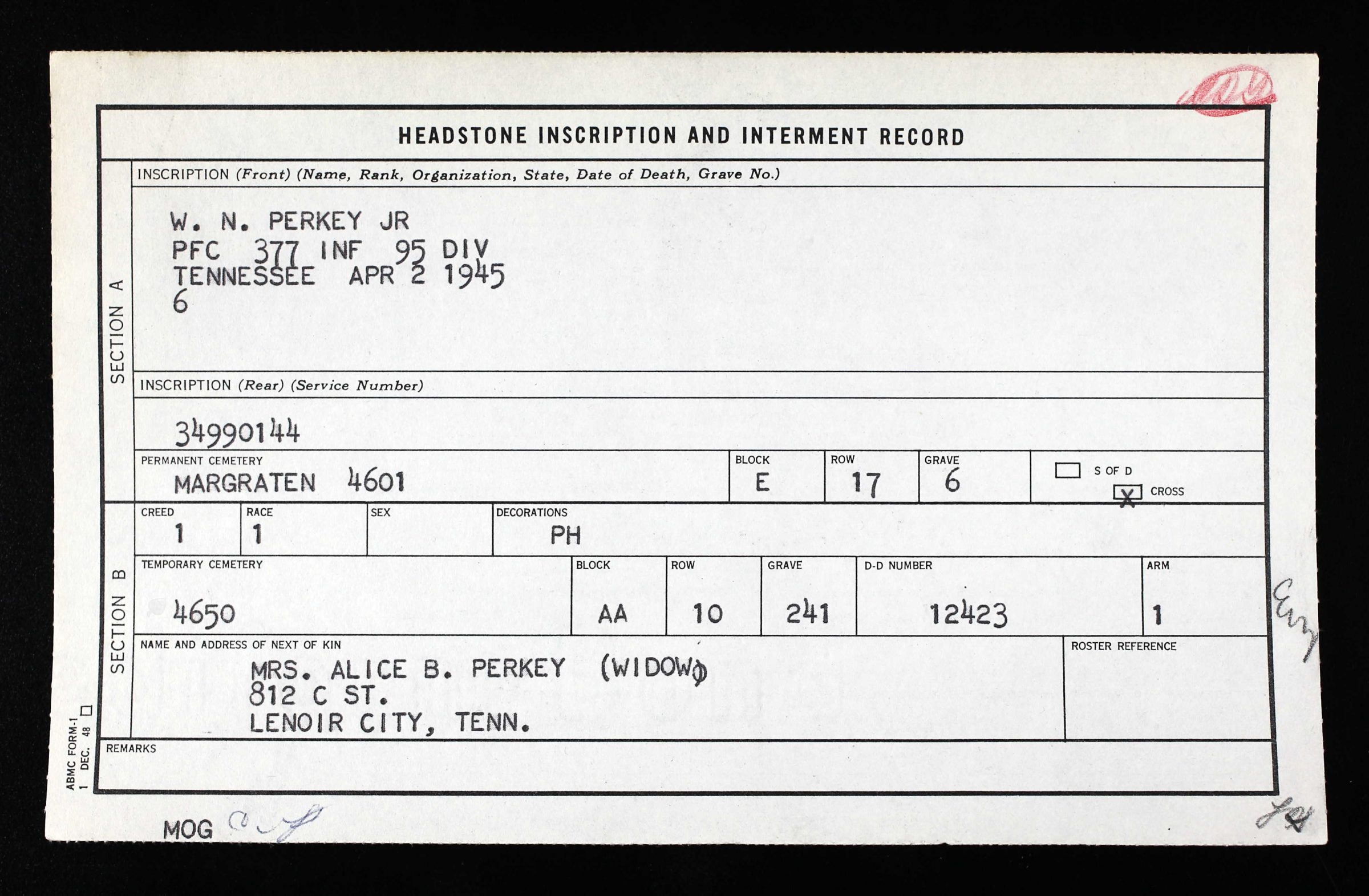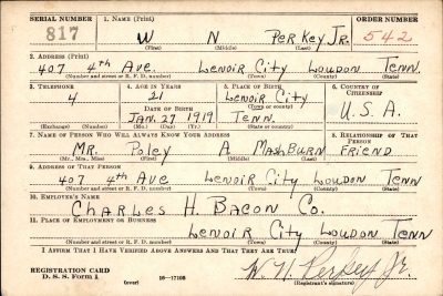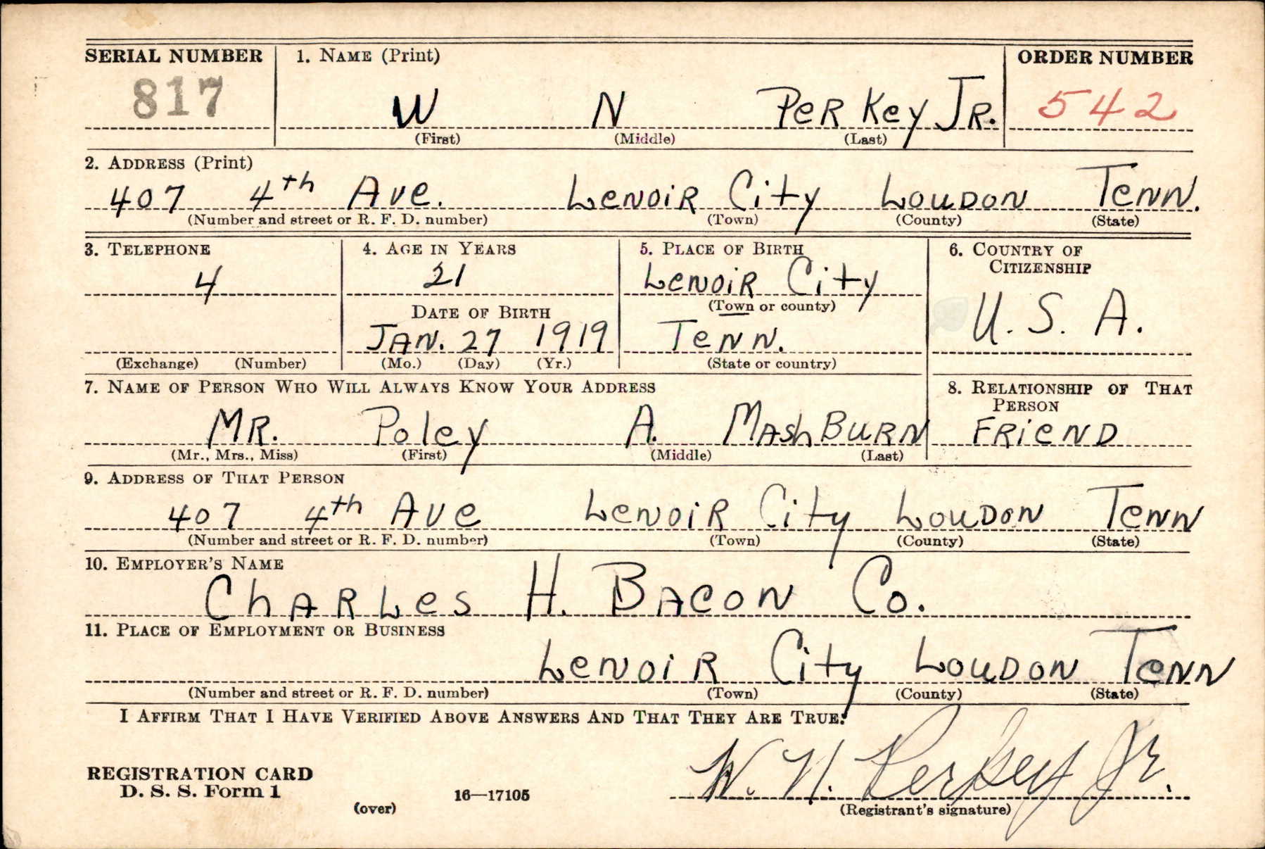 W.N. (William Nimrod) Perkey was the son of William Nimrod Perkey and Tessie Spine Goodwin. He was married to Alice Muriel Burns and father of Wiliam David Perkey and