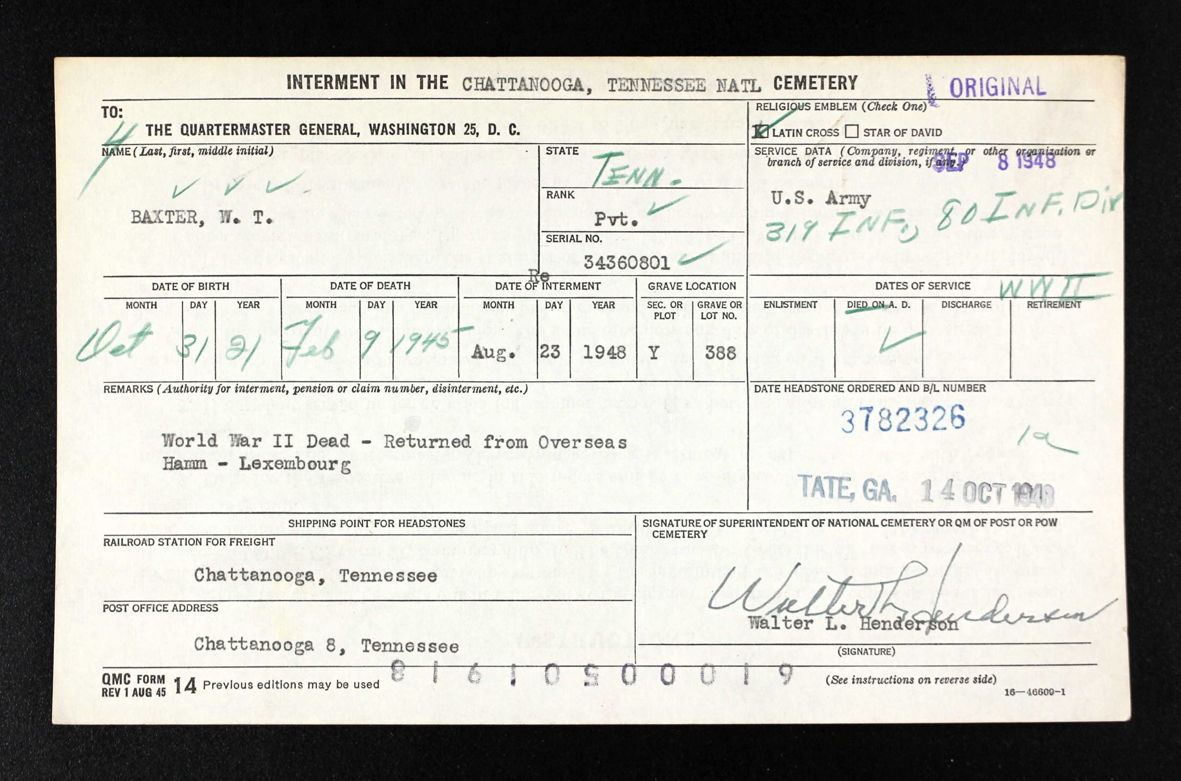 He was returned from Hamm – Luxembourg and is buried at Chattanooga National Cemetery, Y, 388