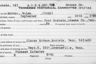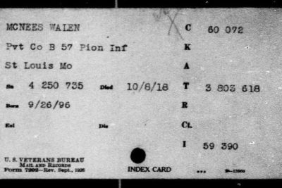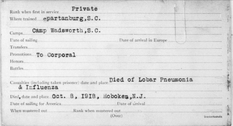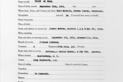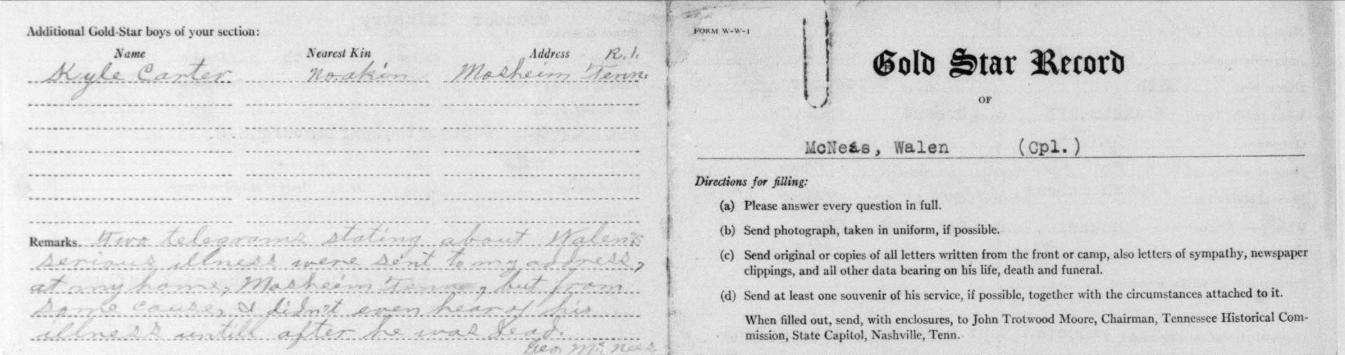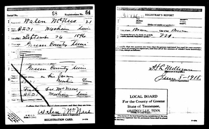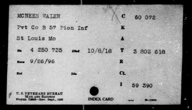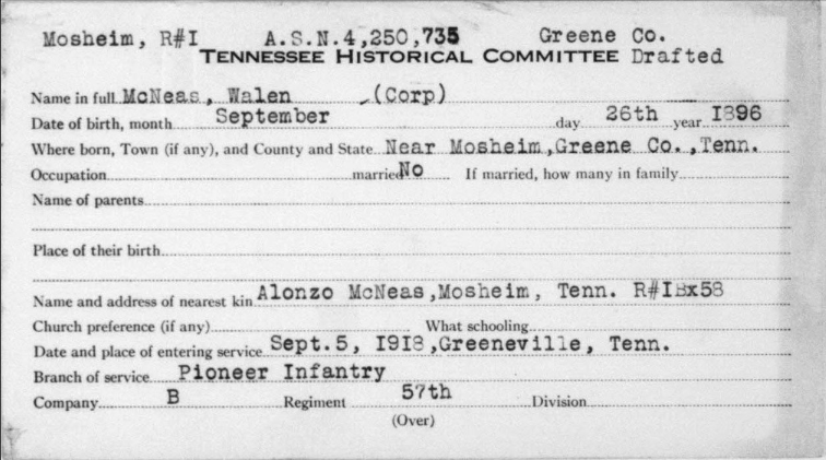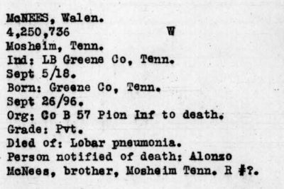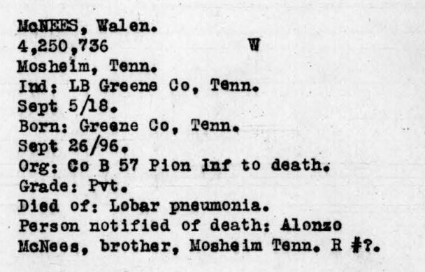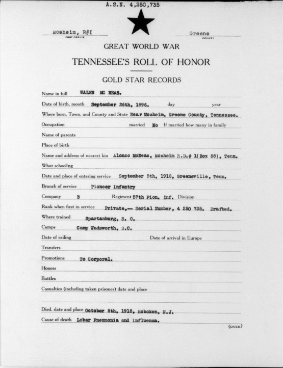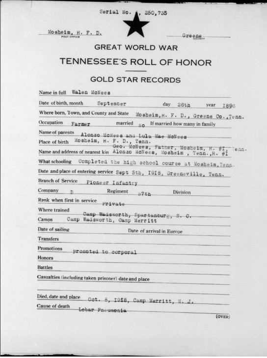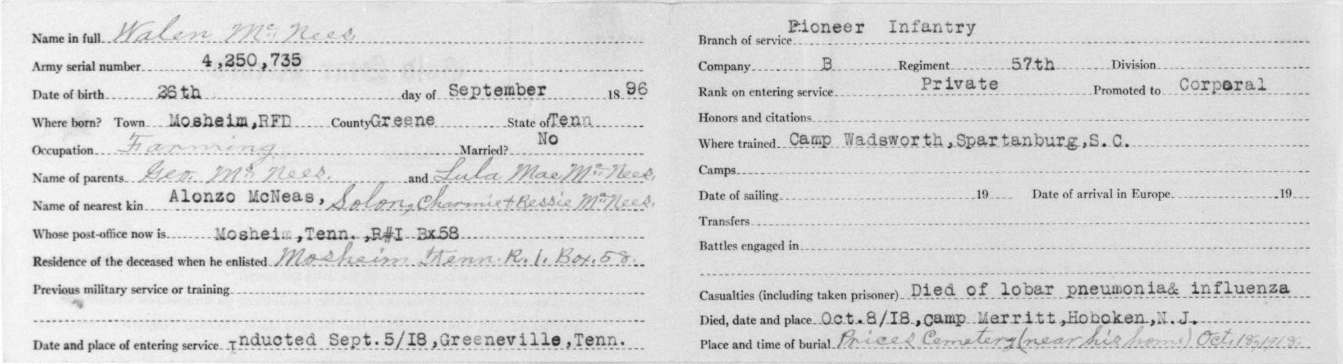 Walen McNees was born 26 September 1896, Greene County, Tennessee to Alonzo and Lula Mae McNees. He entered the service on 5 September 1918 in Greeneville, Tennessee and trained at Camp Wadsworth at Spartanburg in South Carolina. Died 8 October 1918 of pneumonia and influenza at Camp Merritt in Hoboken in New Jersey. Cpl McNees is buried at Price Cemetery, Baileyton, Greene County in Tennessee.