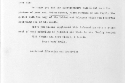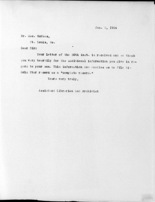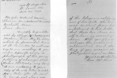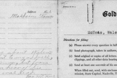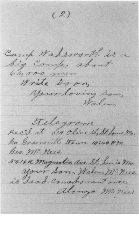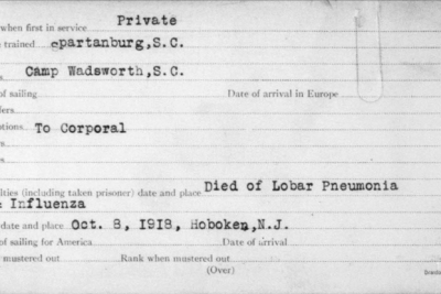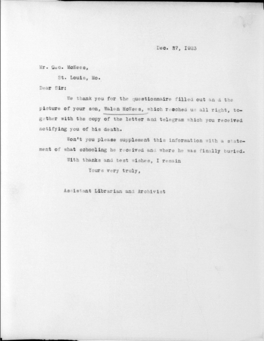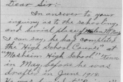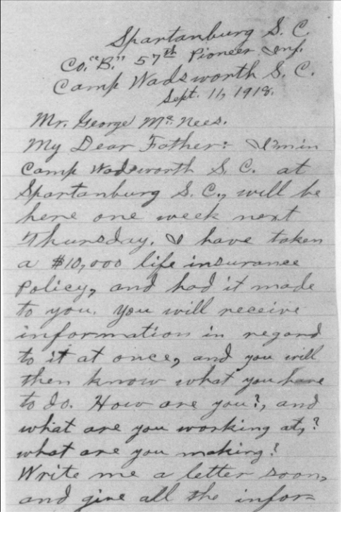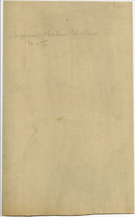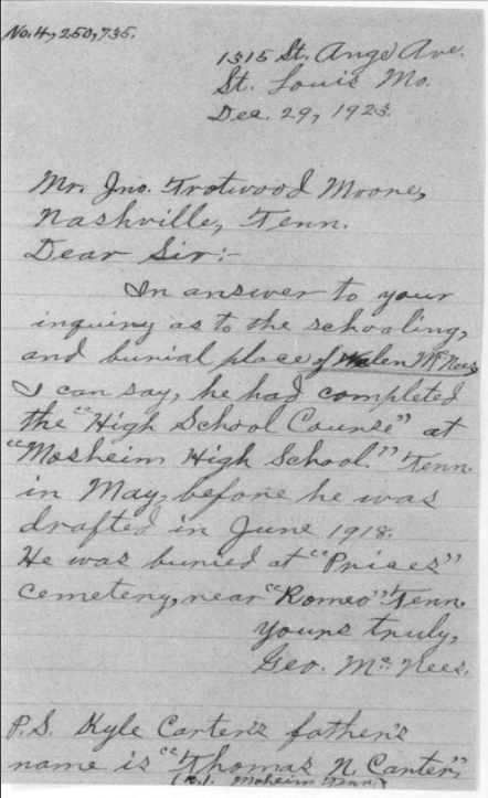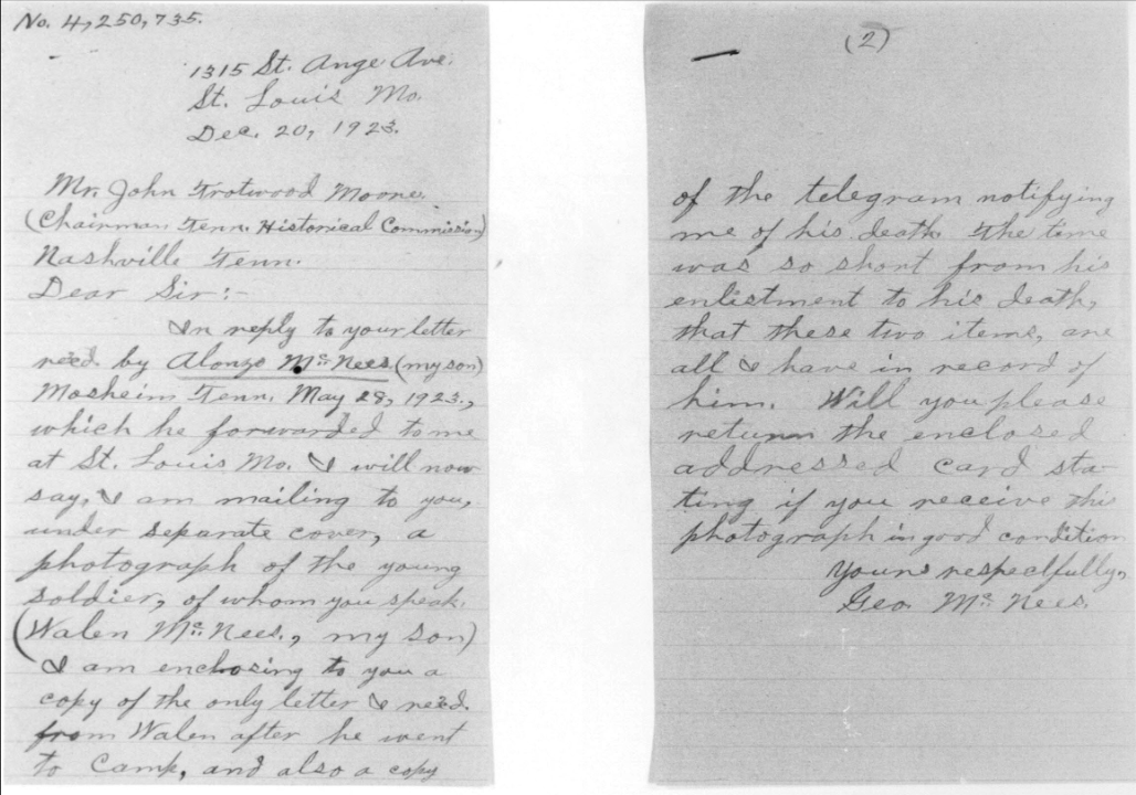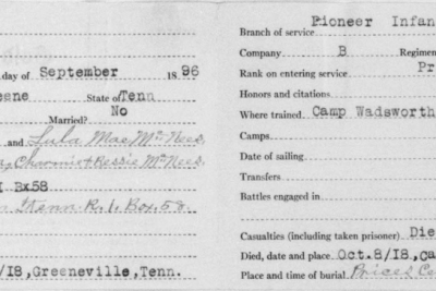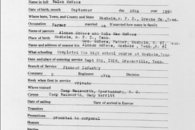 Walen McNees was born 26 September 1896, Greene County, Tennessee to Alonzo and Lula Mae McNees. He entered the service on 5 September 1918 in Greeneville, Tennessee and trained at Camp Wadsworth at Spartanburg in South Carolina. Died 8 October 1918 of pneumonia and influenza at Camp Merritt in Hoboken in New Jersey. Cpl McNees is buried at Price Cemetery, Baileyton, Greene County in Tennessee.