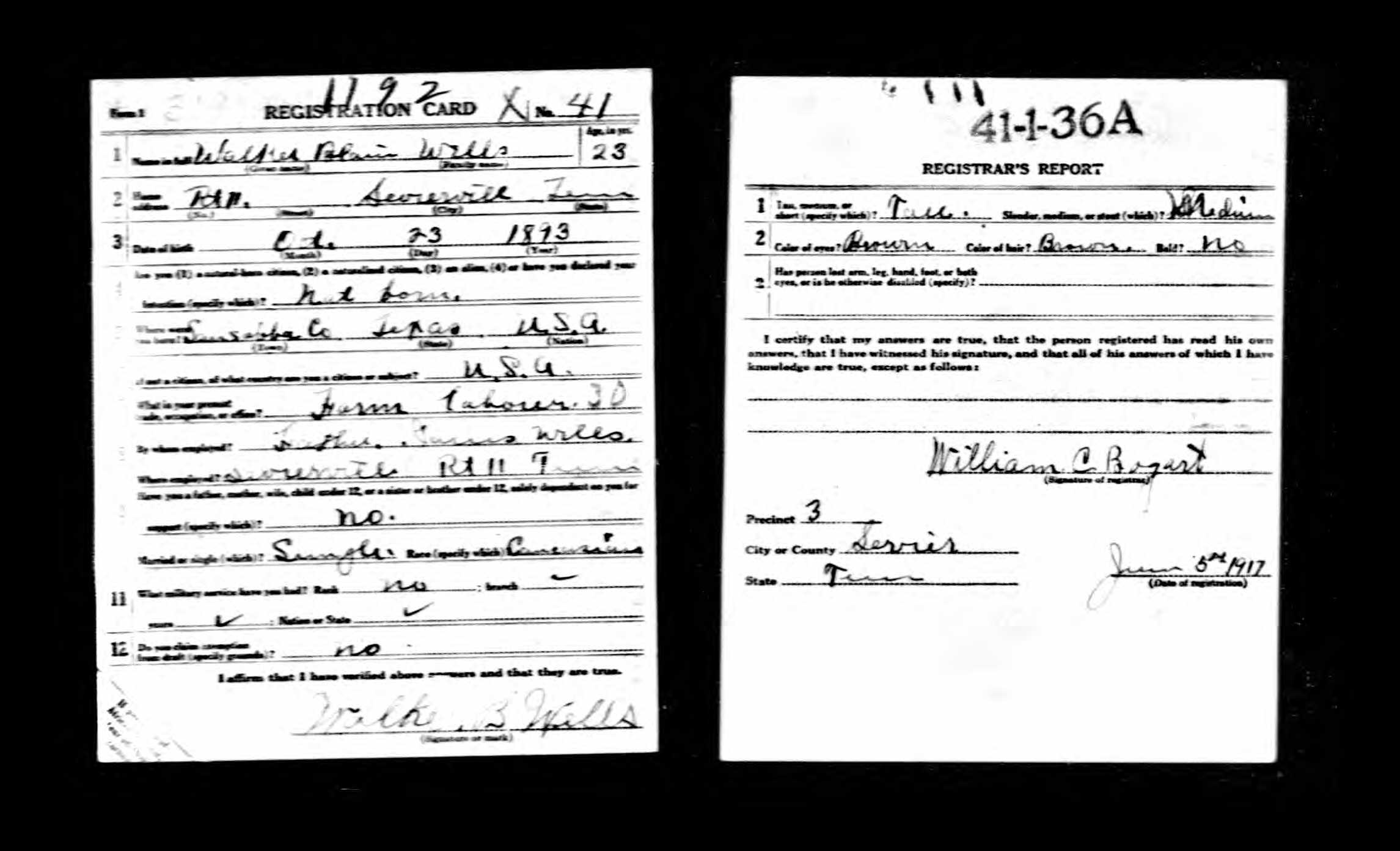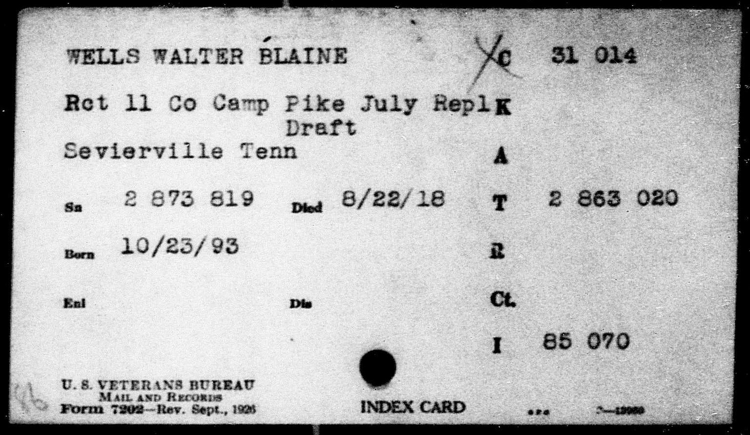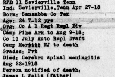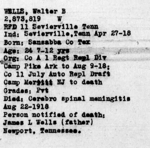 Walker Blaine Wells was born in San Saba County, Texas. Son of James Lawson Wells and Mary Louise Bird. He died at Camp Merritt in New Jersey of cerebro spinal meningitis.