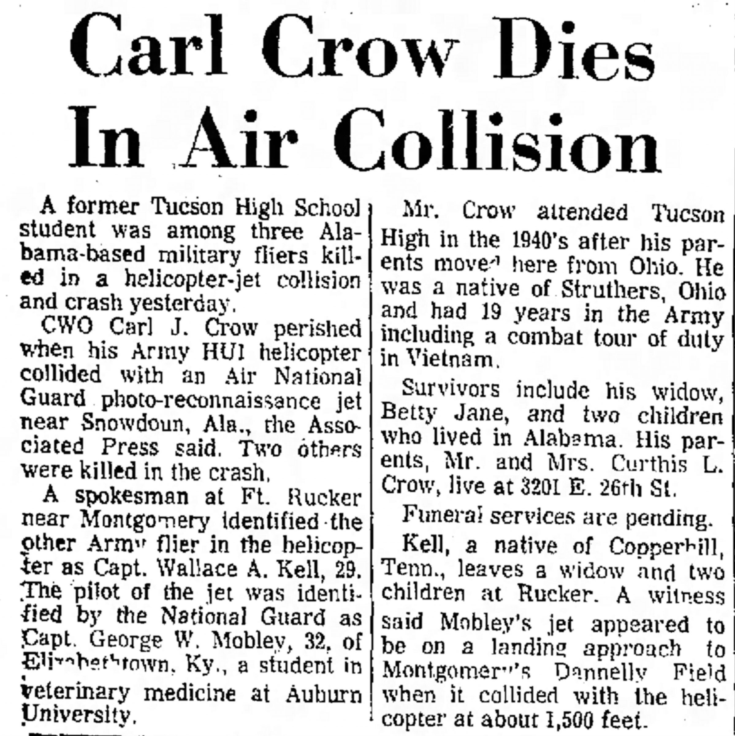 Helicopter fatalities were Captain Wallace A. Kell, 29 of Copperhill, Tennessee and CWO Carl J. Crow, 27, of Tucson, Arizona. Name of the jet pilot was not immediately learned.